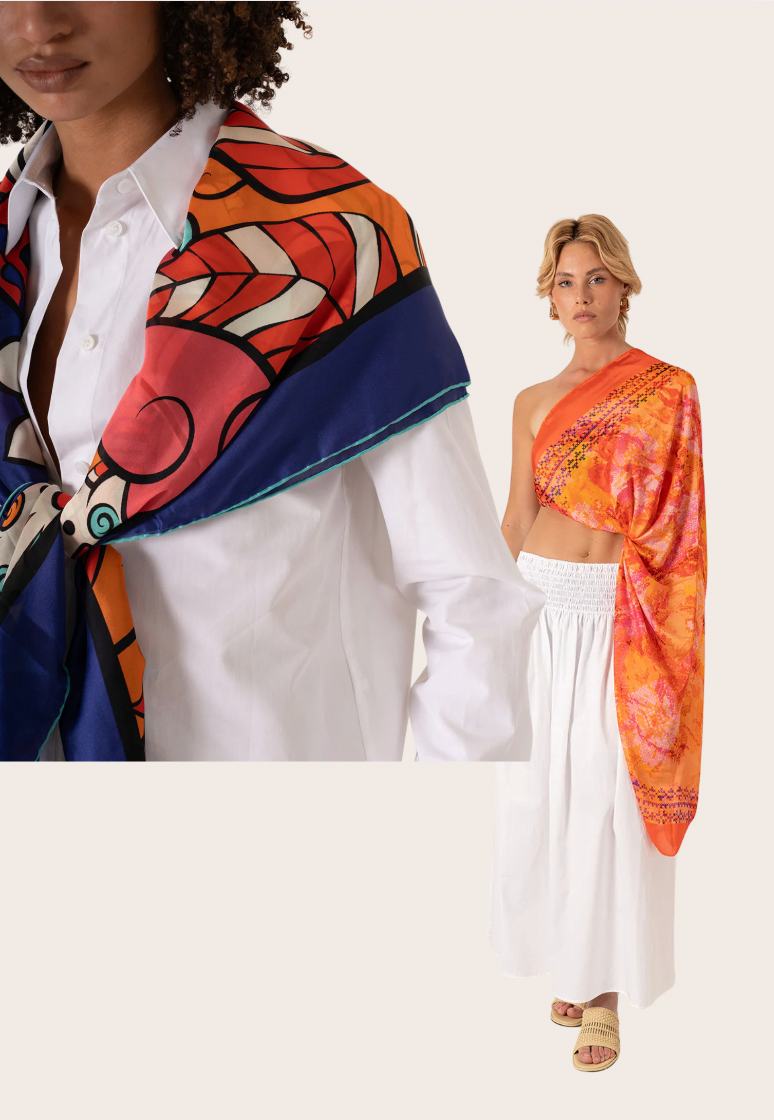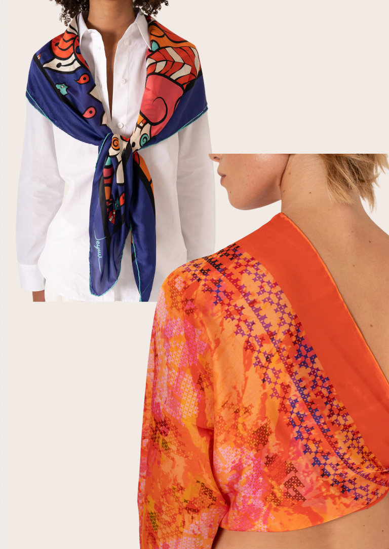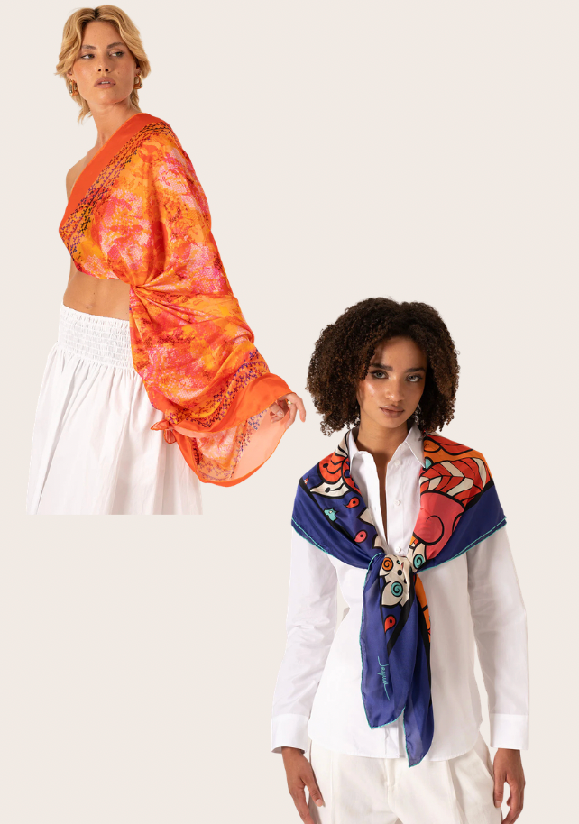Festival d’Arte ve Amore Segreto… Biri özgür fırça darbelerinin enerjisini taşıyan sanatsal bir festival, diğeri pastel tonların narinliğiyle duygusal bir zarafeti yansıtan romantik bir yorum. Bu özel paket, iki büyük 123x123 cm Alfa Silk fuları tek bir seçkide buluşturarak hem yaratıcılığı hem duyguyu stiline taşımak isteyenler için hazırlandı. Festival d’Arte el çizimi soyut figürleri ve renklerin serbest akışıyla modern bir sanat dokunuşu sunarken; Amore Segreto’nun yumuşak renk geçişleri ve ince detayları daha sakin, duygusal bir ifade yaratır. Her ikisi de pareo, omuz şalı, saç aksesuarı veya üst giyim tamamlayıcısı olarak çok yönlü kullanım imkânı verir. Bir fularla sanat, diğeriyle duygu—iki farklı ruh, tek paket içinde.