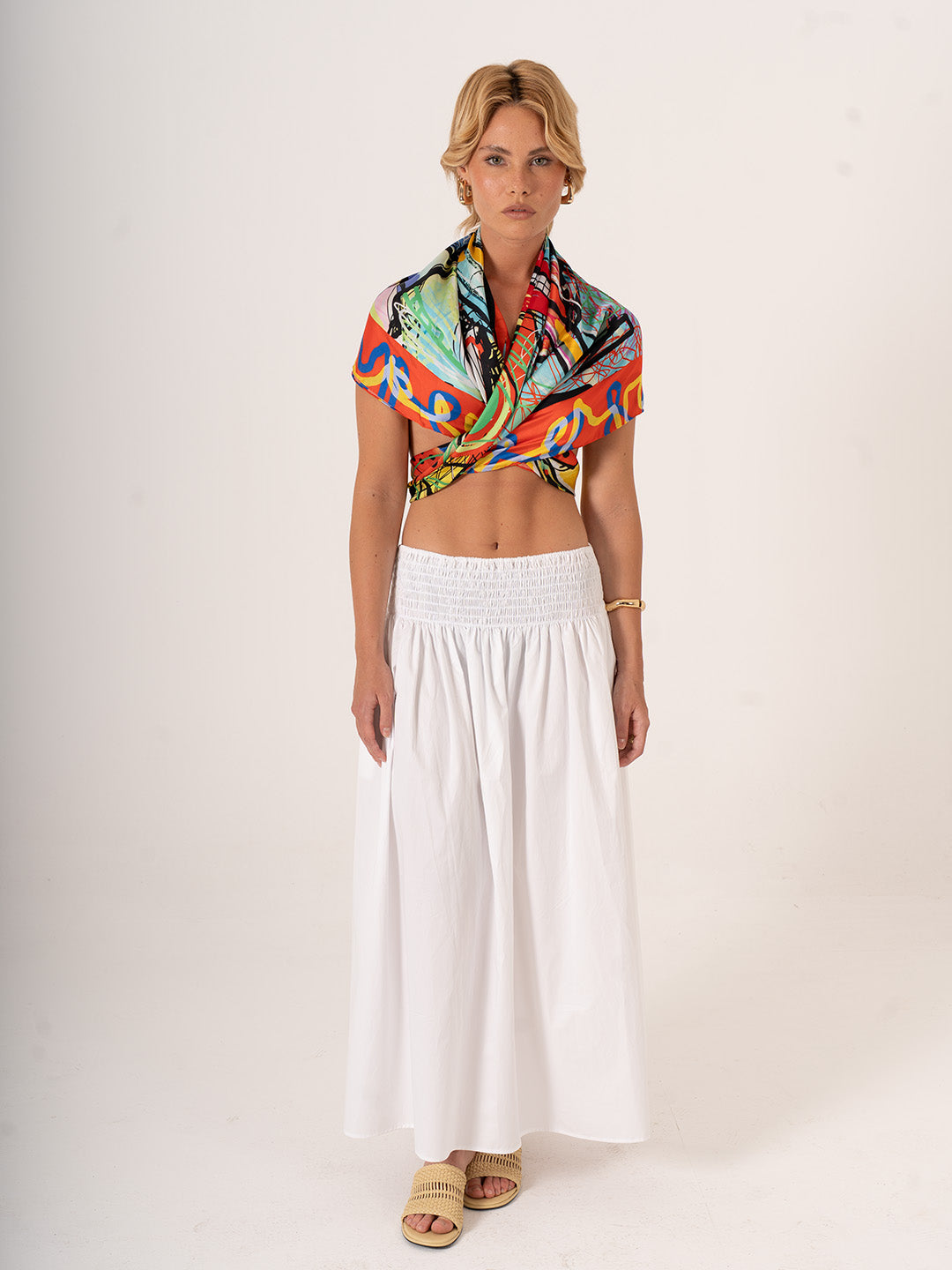 123x123 cm ölçüsündeki geniş yapısıyla hem klasik fular kullanımına hem de pareo, üst giyim tamamlayıcısı ya da başörtüsü olarak yaratıcı kombinlere uygundur. Hafif ve dökümlü alfa silk kumaşı sayesinde zarif bir akış sağlar.