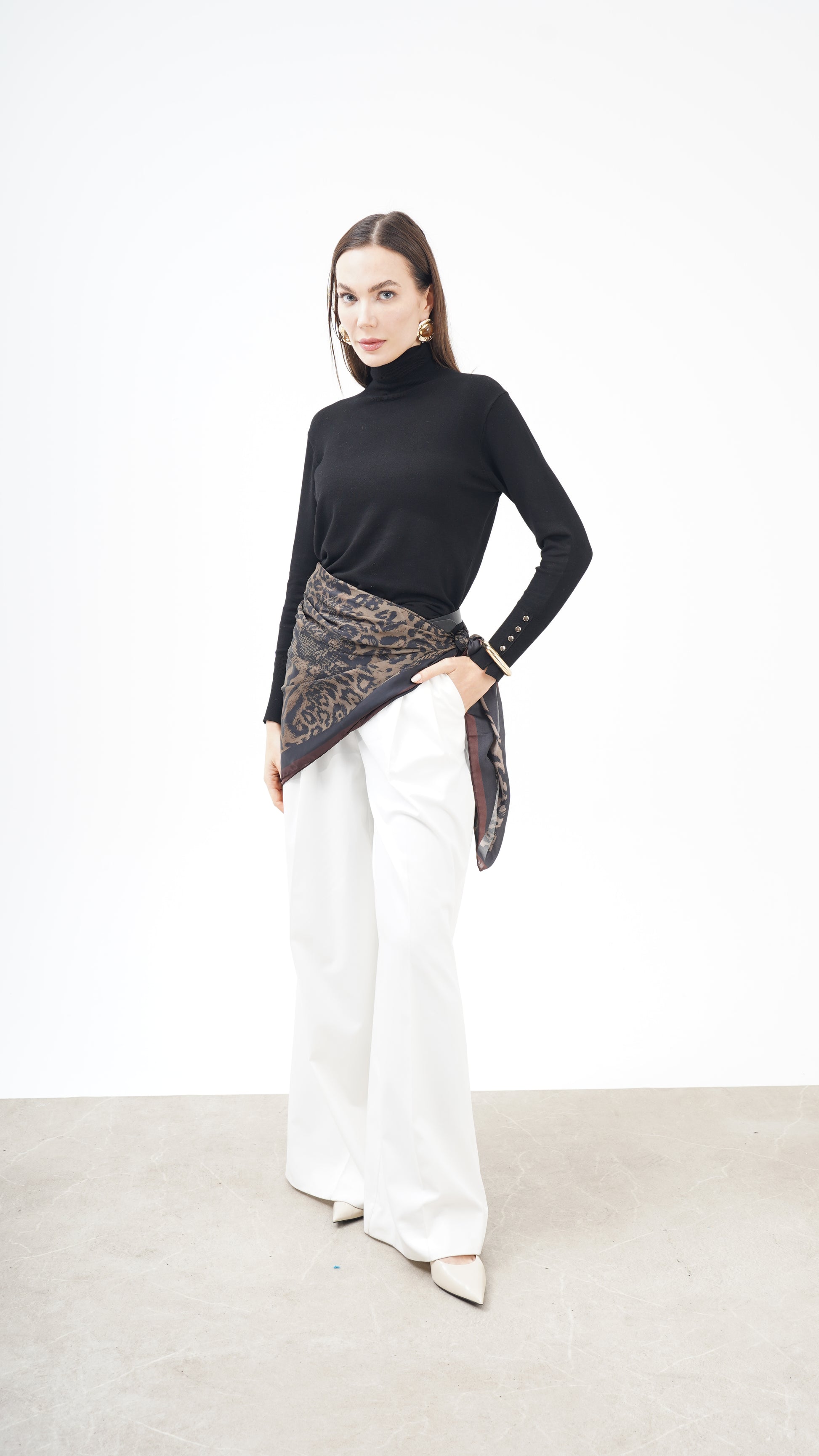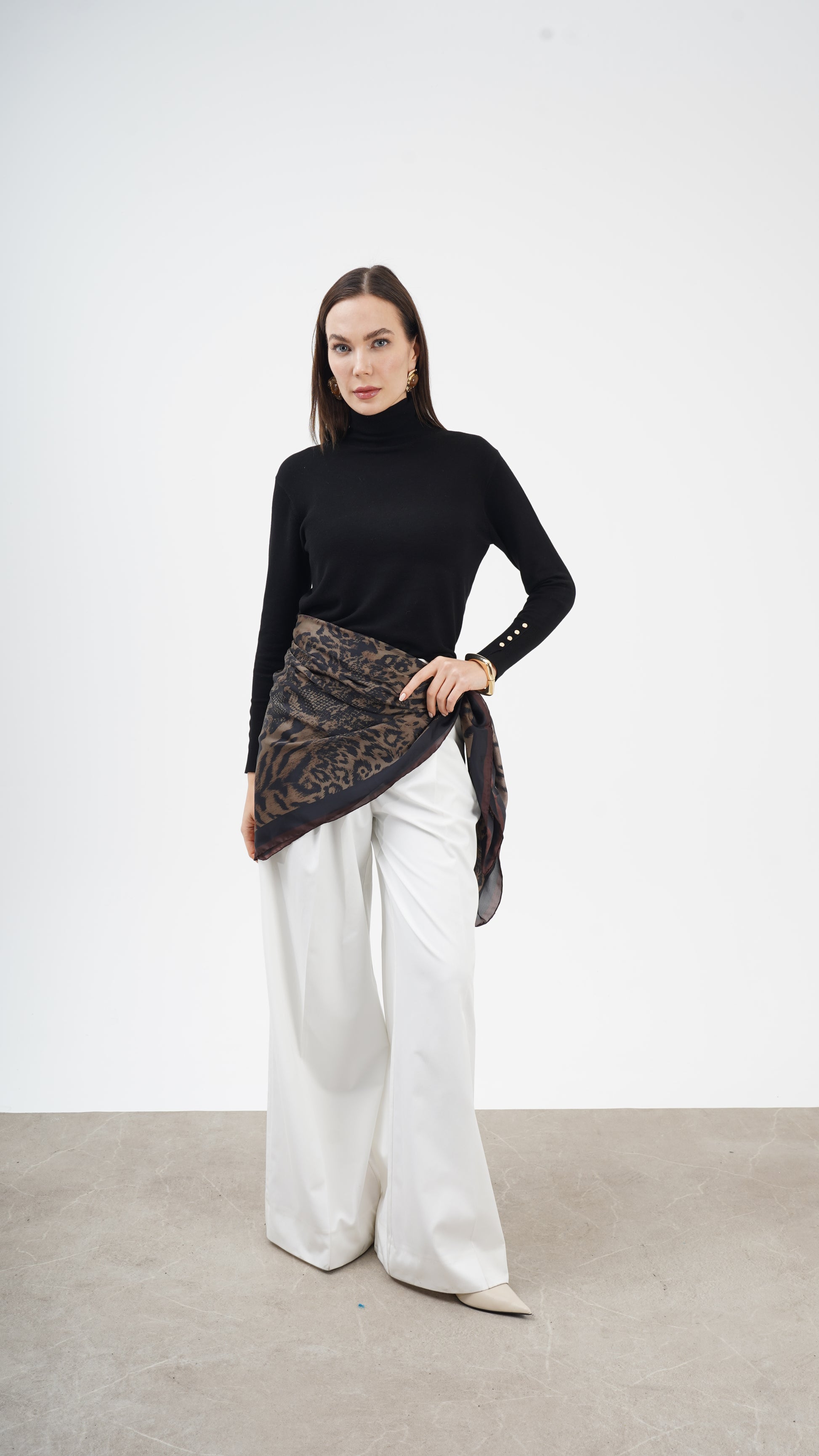 123 cm geniş ölçüsü sayesinde belde sarong etkisi, omuzda şal formu ya da boyunda hacimli ve iddialı bir kullanım sunar. Alfa silk dokusu hafif, akışkan ve pürüzsüzdür; hacimli görünmesine rağmen rahat bir taşıma sağlar.