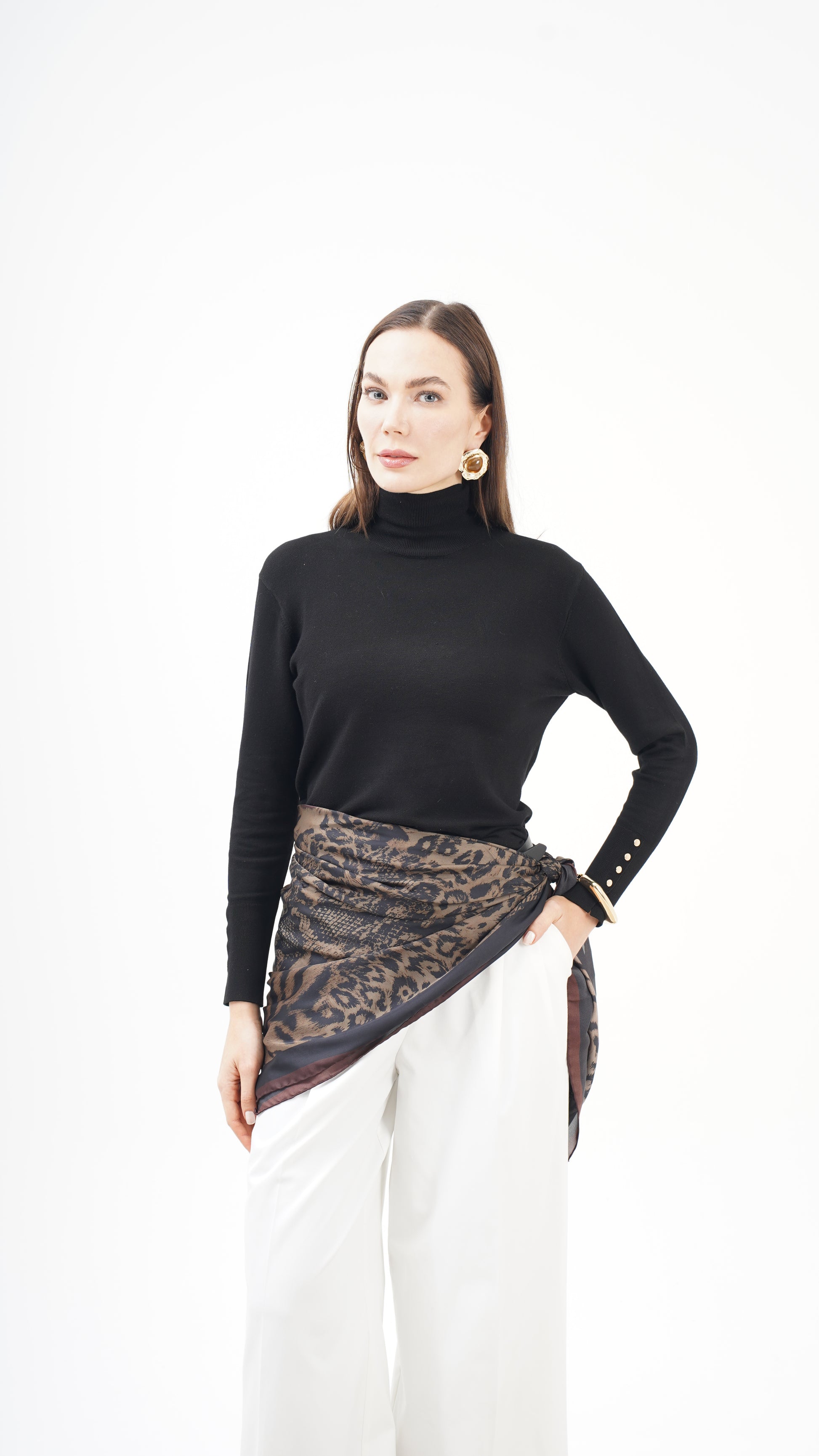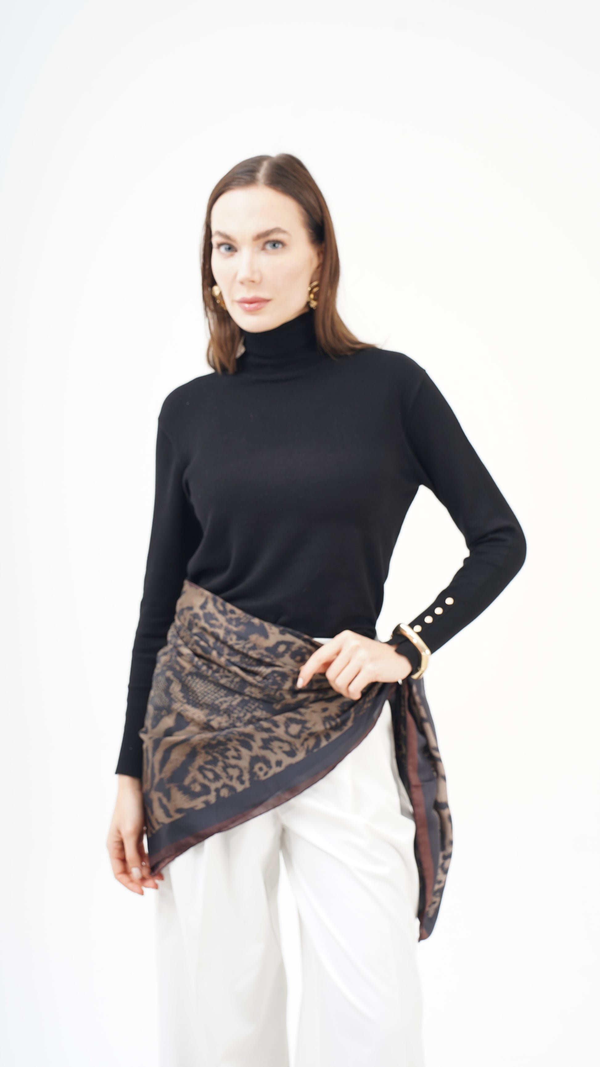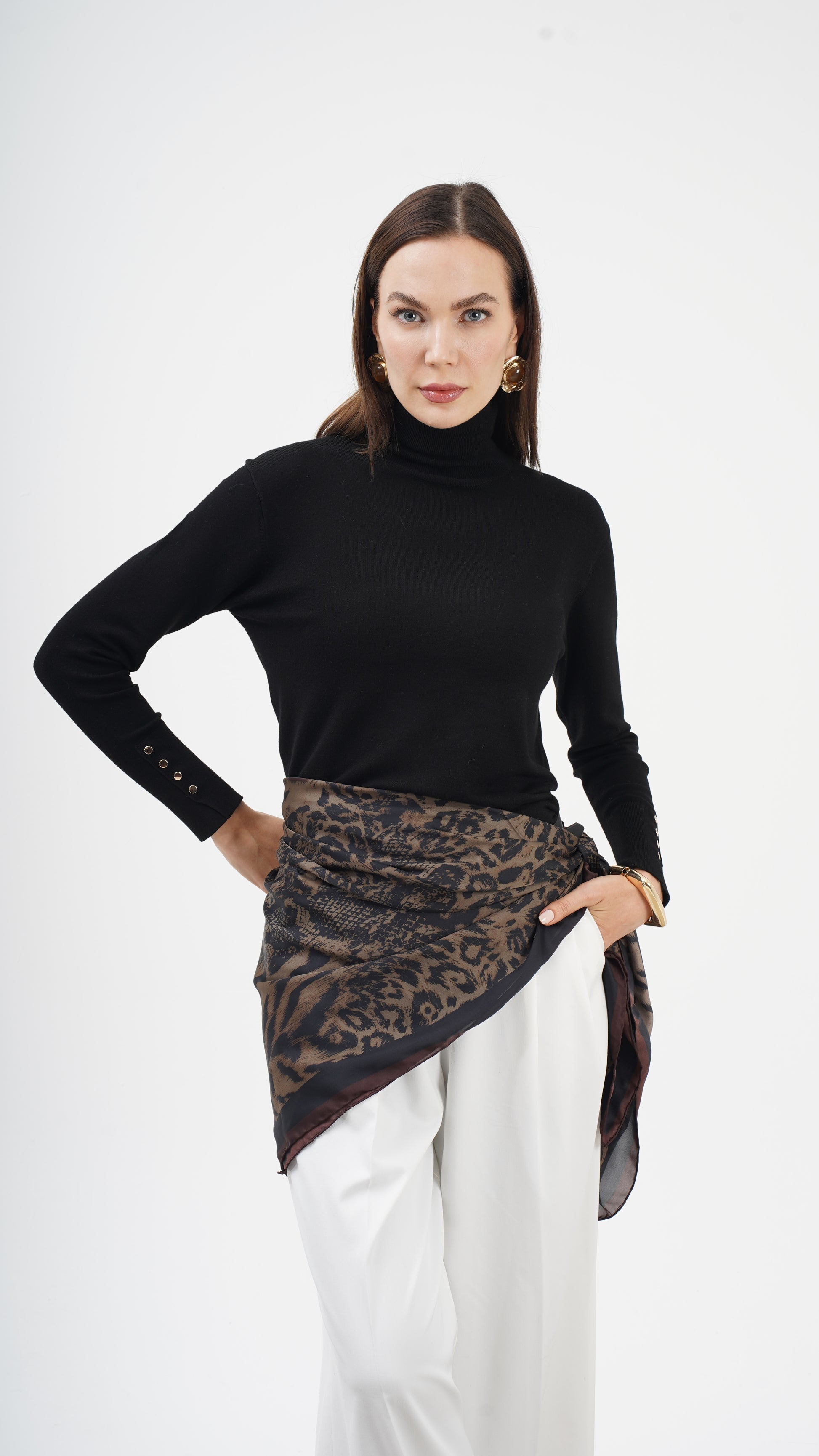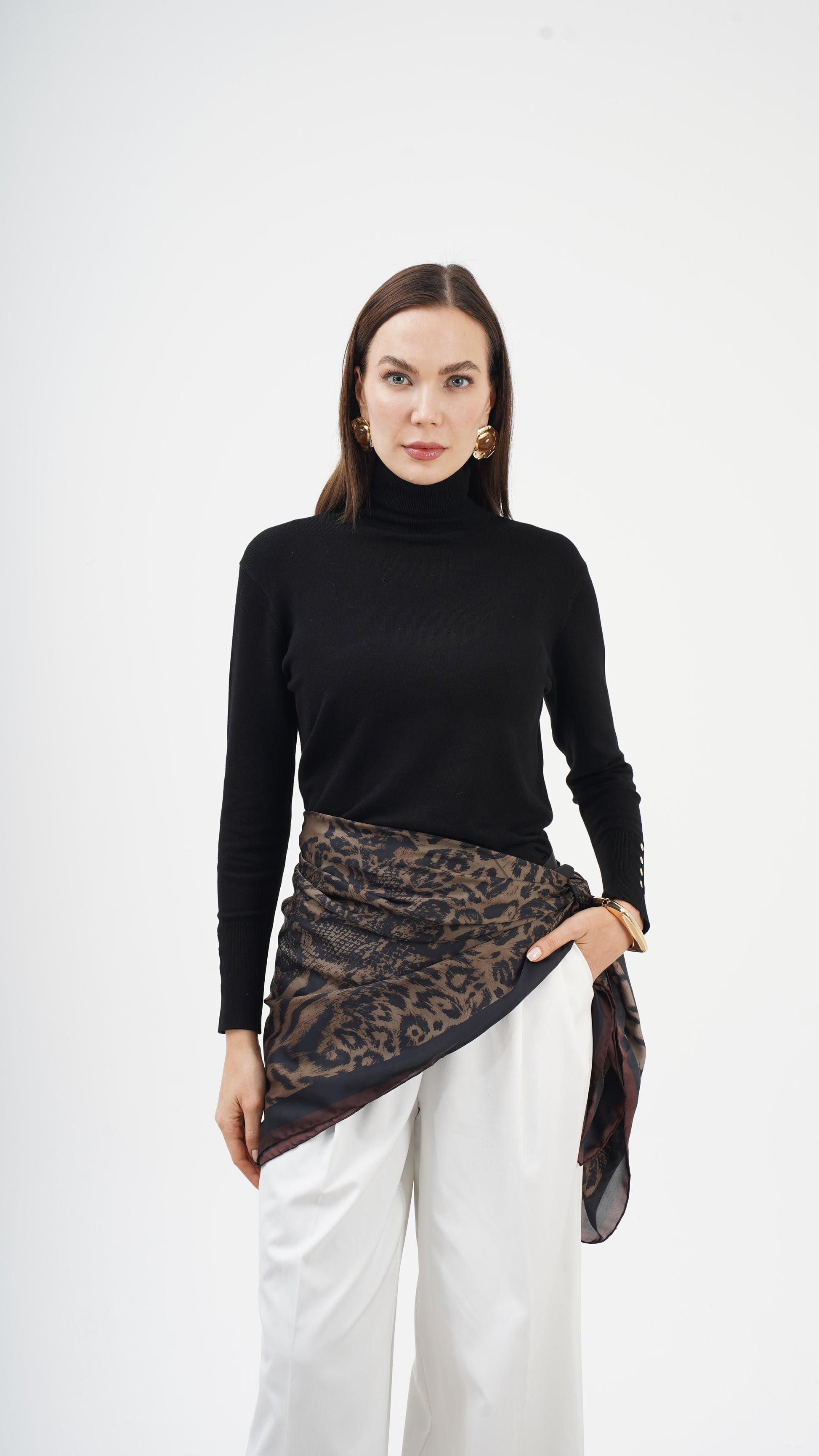 Kahve ve siyah tonların doğal uyumu, desenin derinliğini artırırken stil dilini zamansız kılar. Hem klasik kombinlerle hem modern silüetlerle güçlü bir bütünlük kurar. Bu parça tamamlayıcı değil, karakter belirleyicidir.