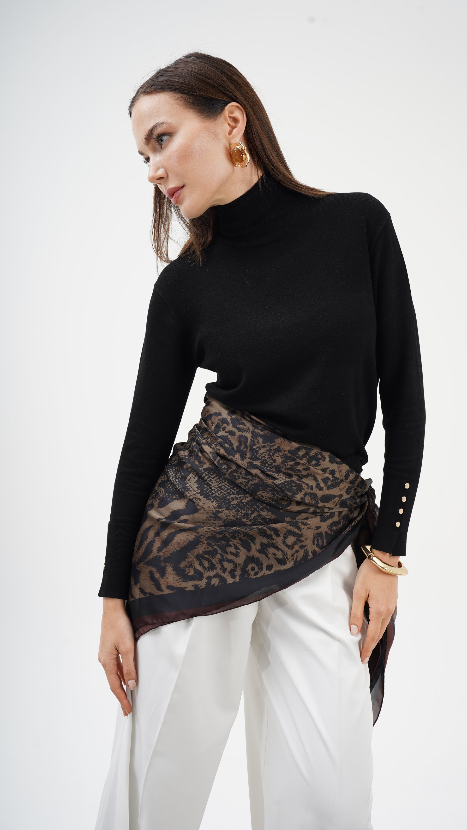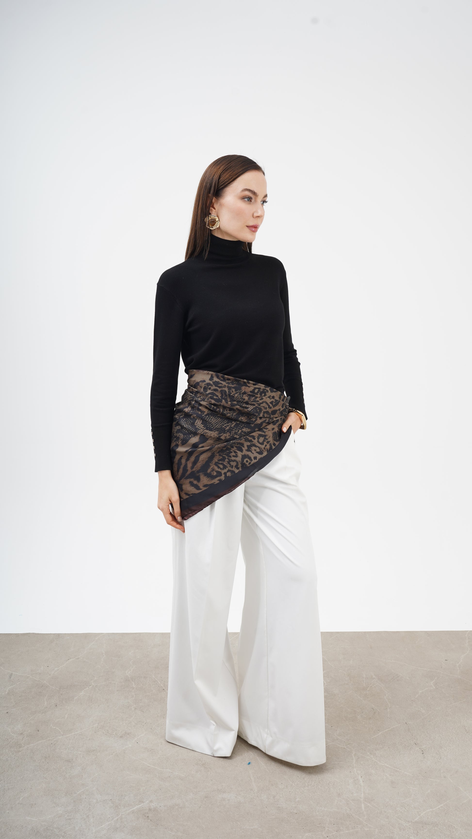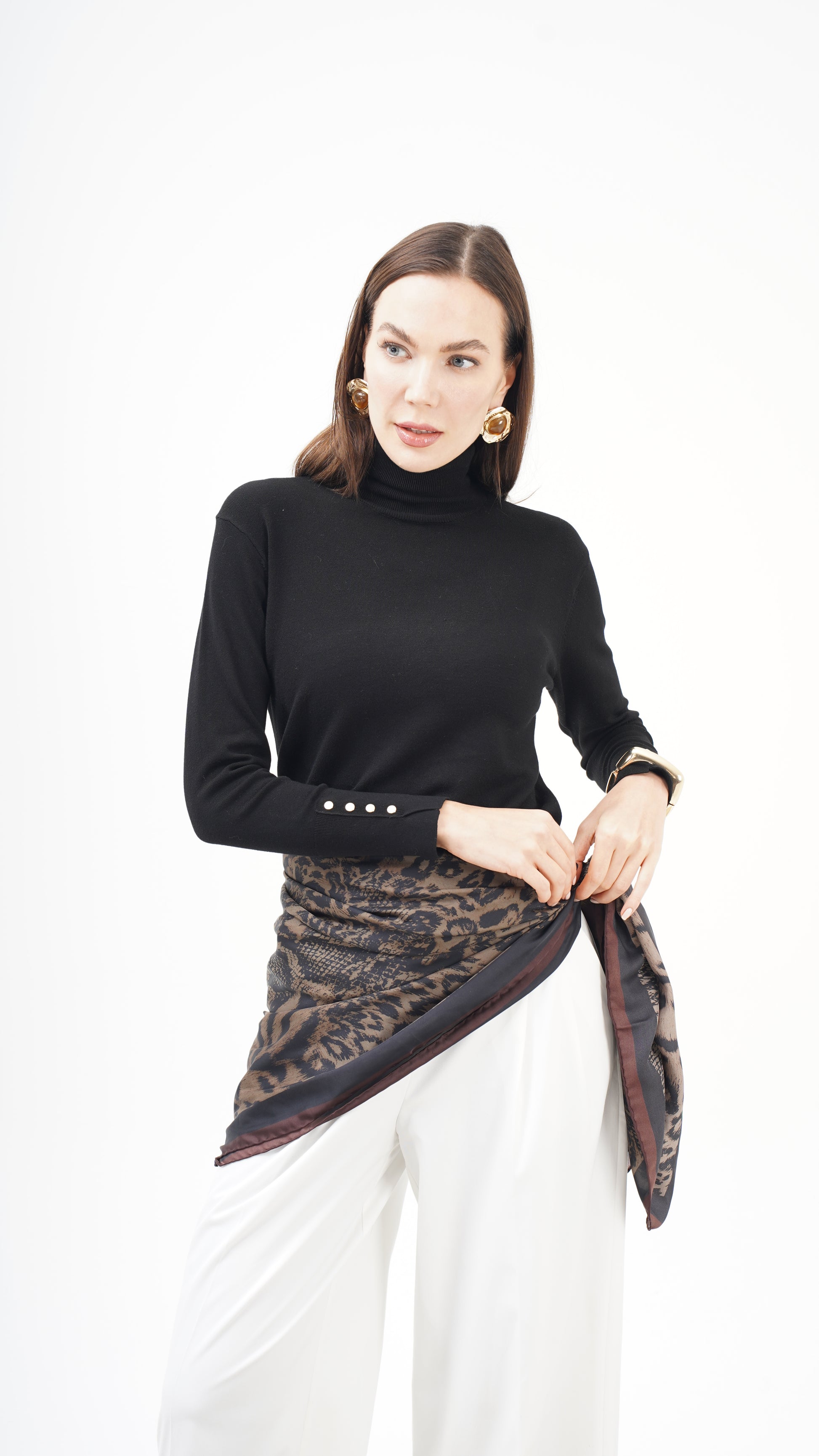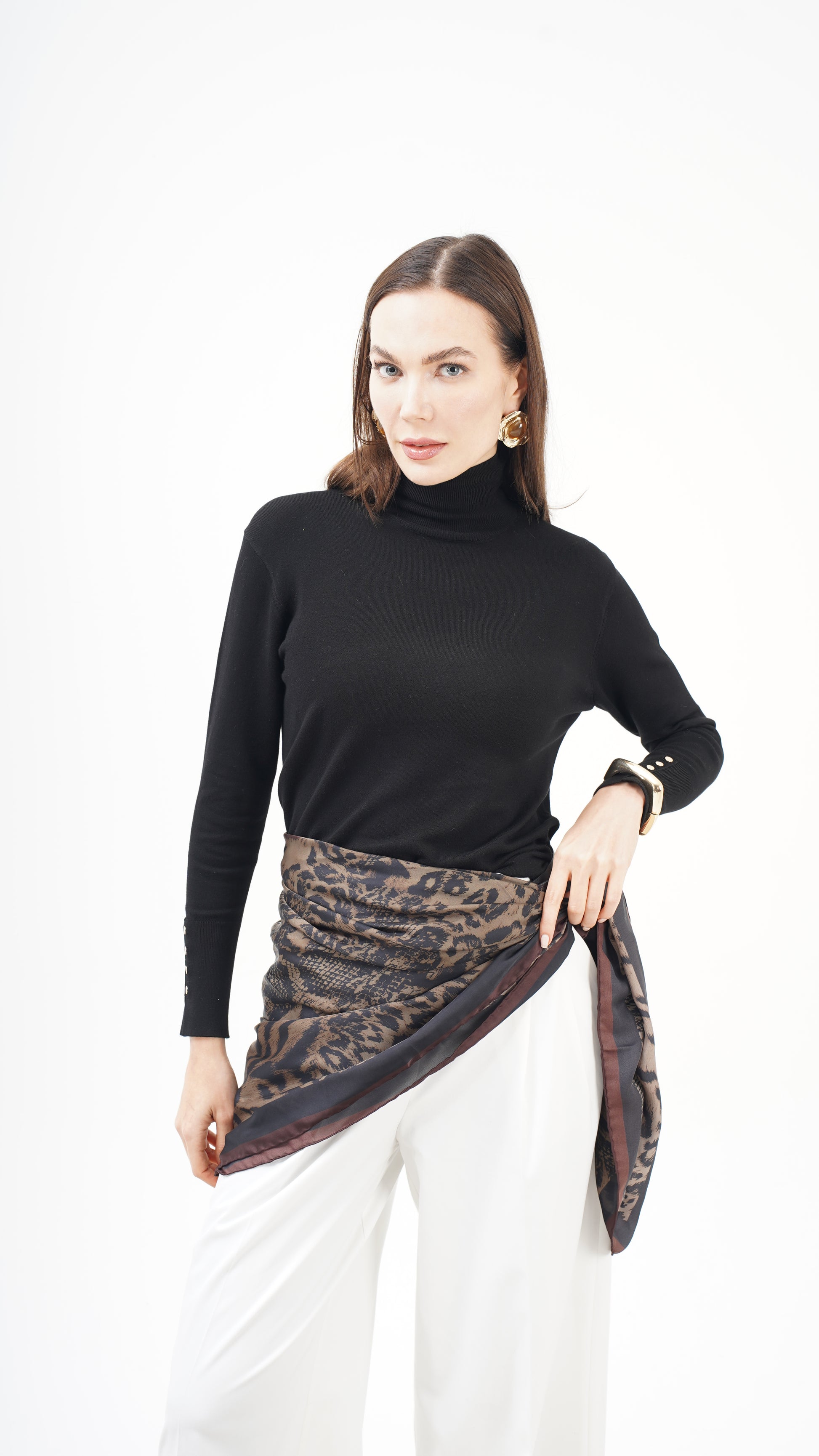 Kahve ve siyah tonların doğal uyumu, desenin derinliğini artırırken stil dilini zamansız kılar. Hem klasik kombinlerle hem modern silüetlerle güçlü bir bütünlük kurar. Bu parça tamamlayıcı değil, karakter belirleyicidir.