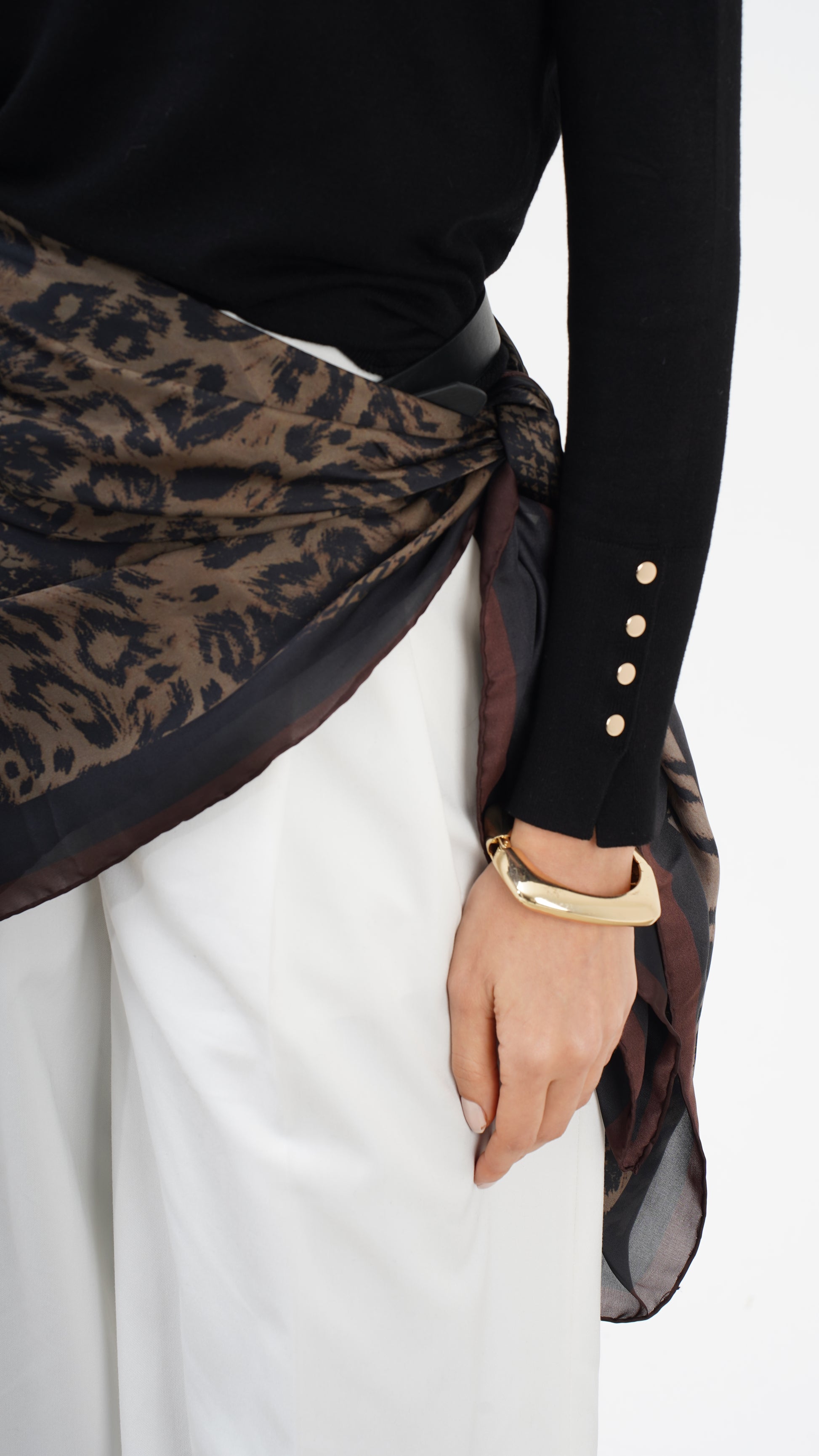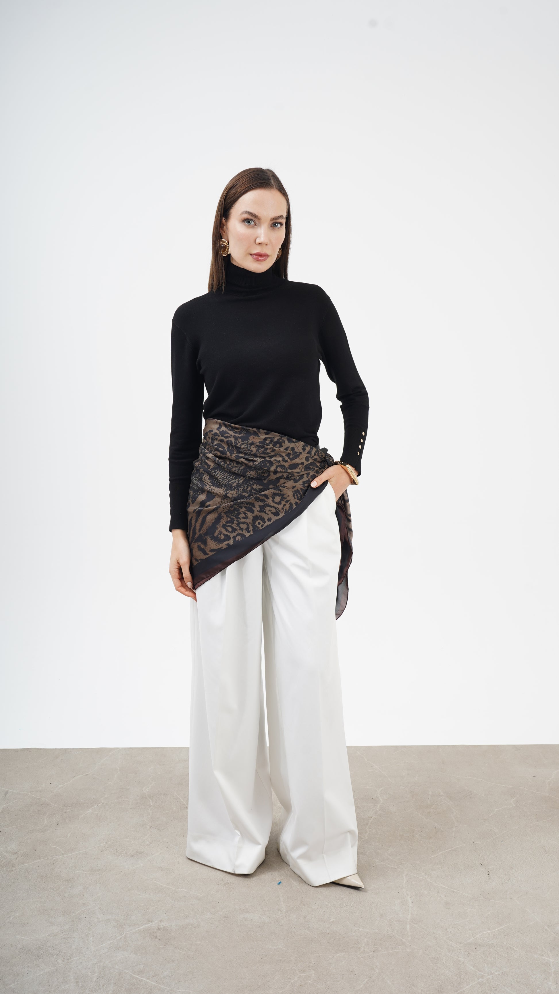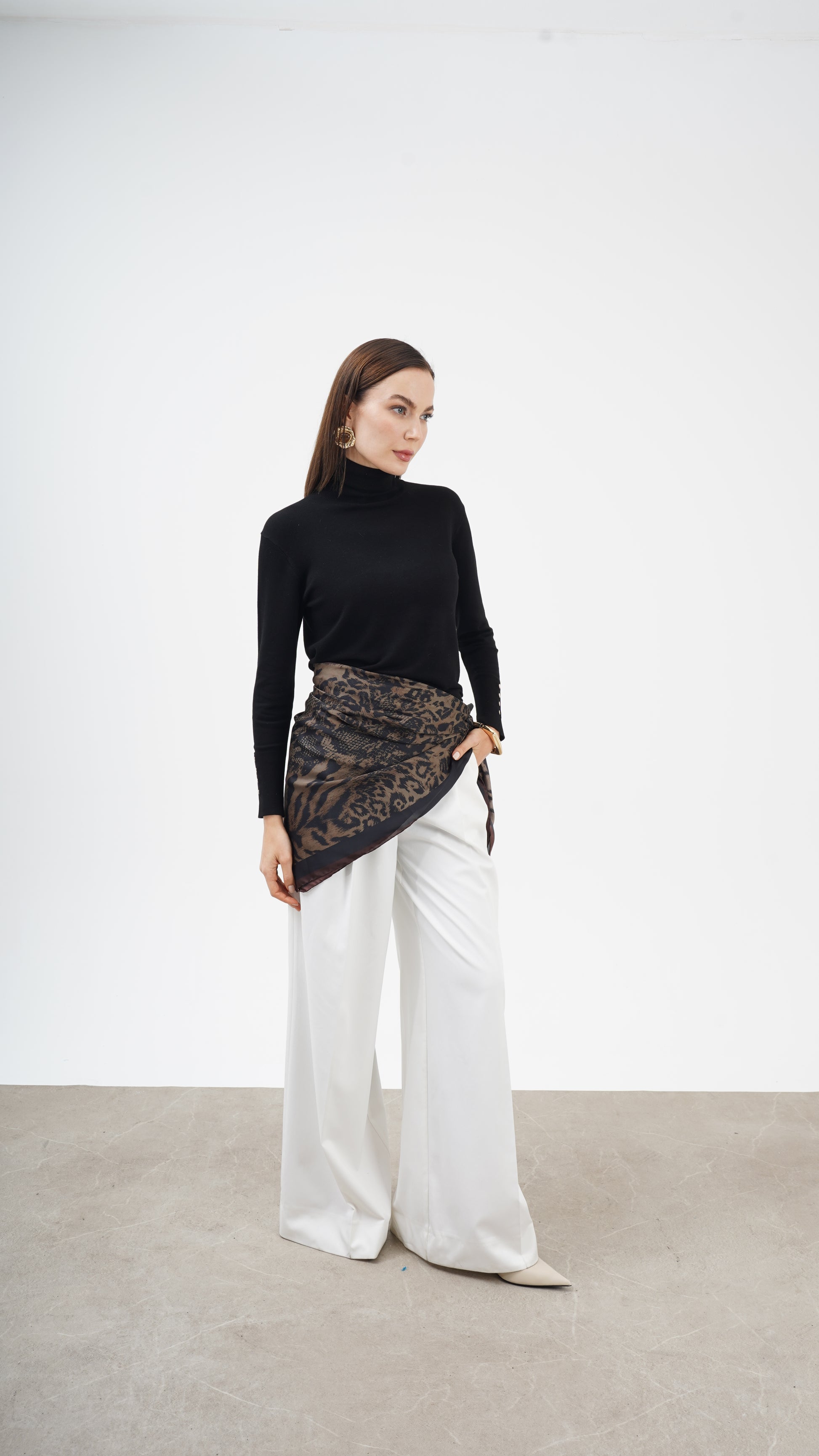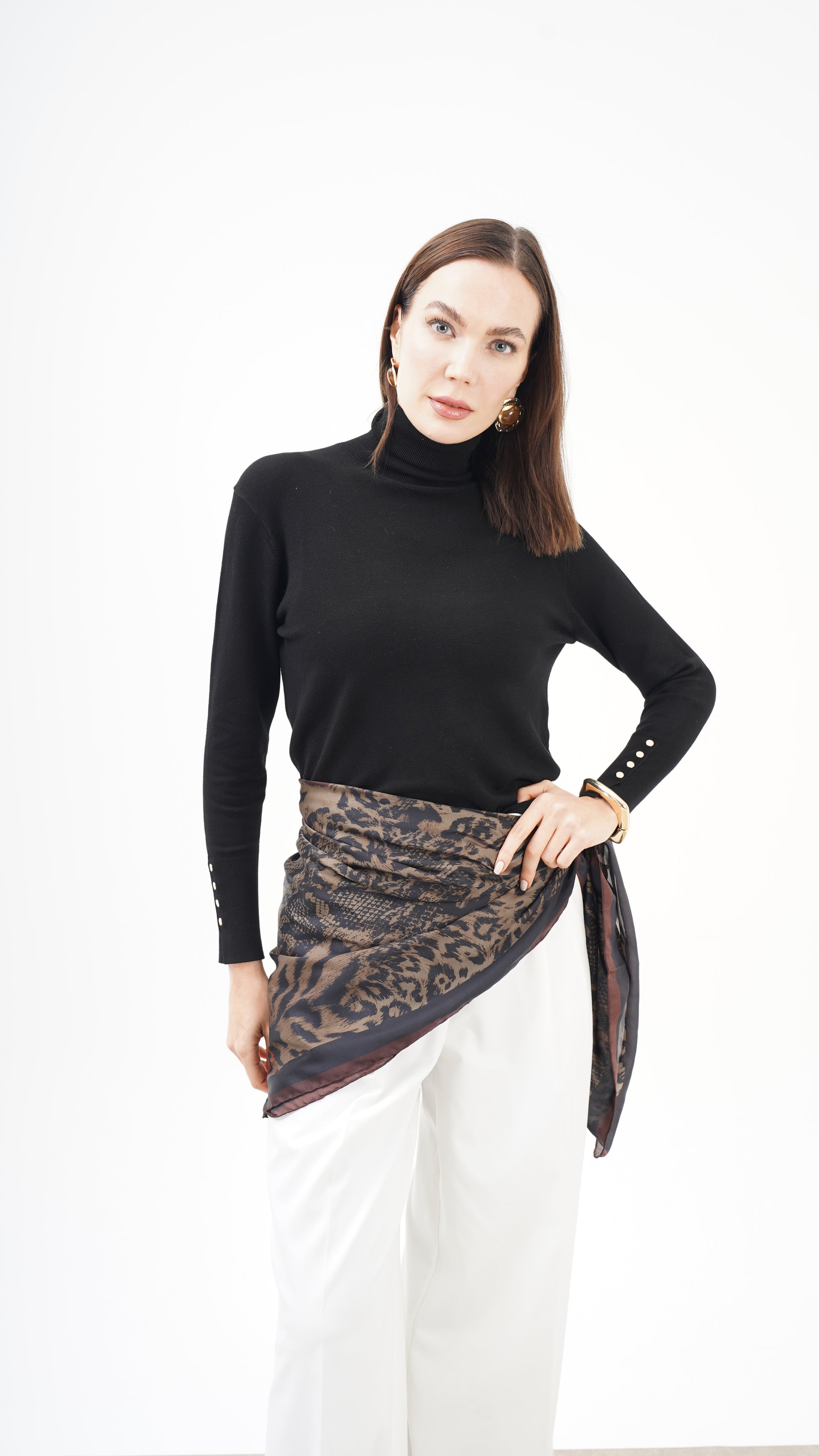 Kahve ve siyah tonların doğal uyumu, desenin derinliğini artırırken stil dilini zamansız kılar. Hem klasik kombinlerle hem modern silüetlerle güçlü bir bütünlük kurar. Bu parça tamamlayıcı değil, karakter belirleyicidir.