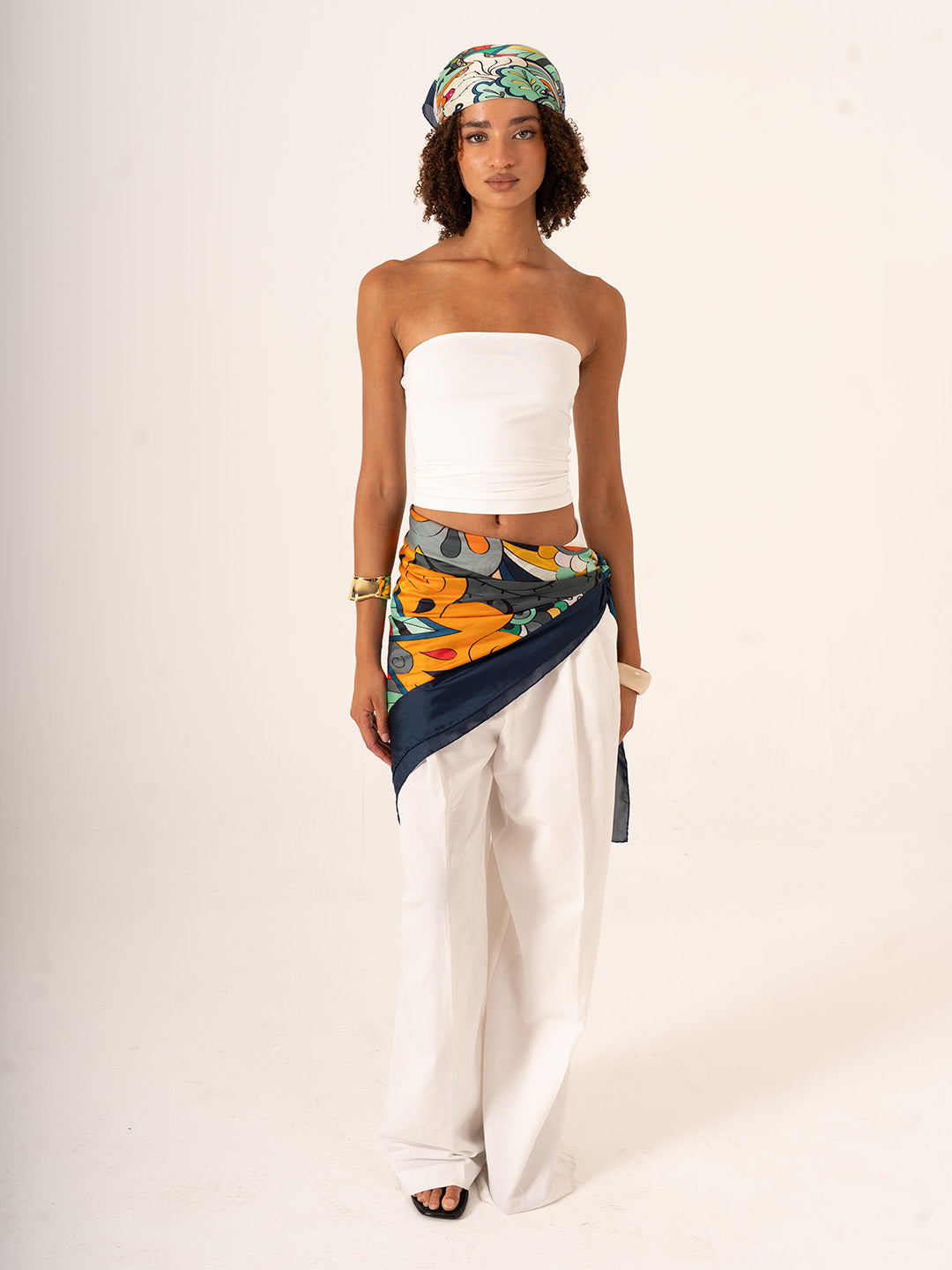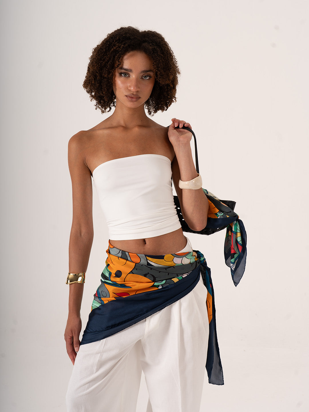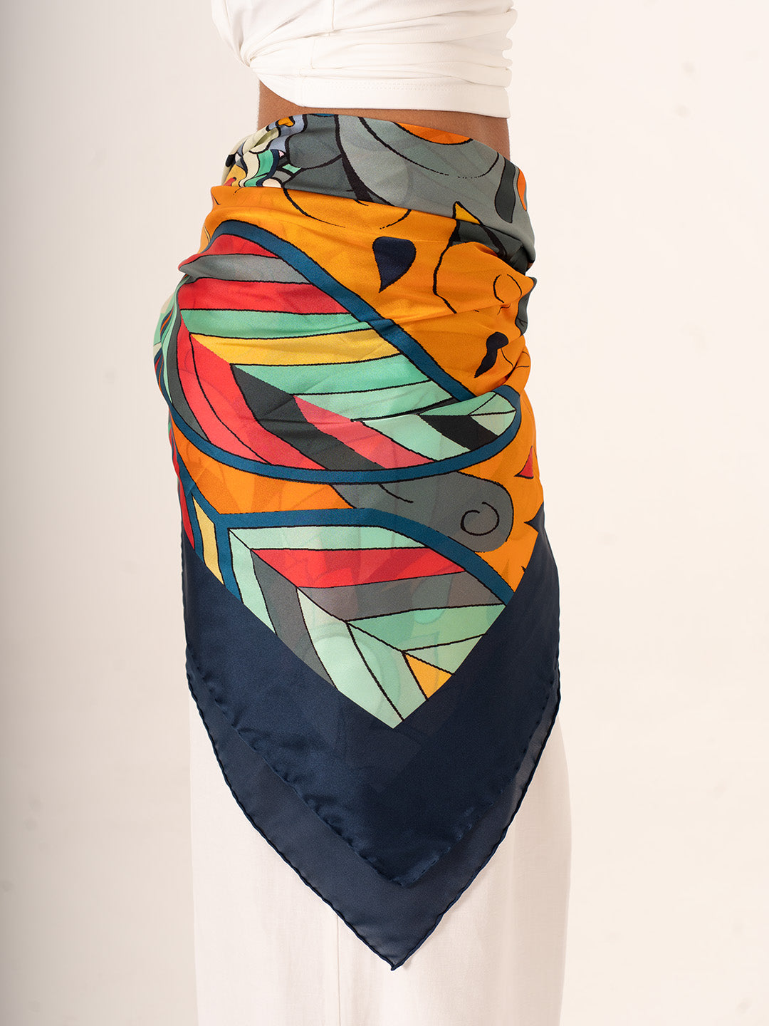 123x123 cm ölçüsüyle hem geniş kullanım alanı hem de görsel etki sunar: boynunuza kendine has bir hava katabilir, omuzunuza zarafet getirebilir veya saçınıza veya çantanıza sanat dolu bir detay olarak dönüşebilir. Alfa silk kumaşı ise hafif, dökümlü ve nefes alabilir yapısıyla uzun süre konfor sağlar.