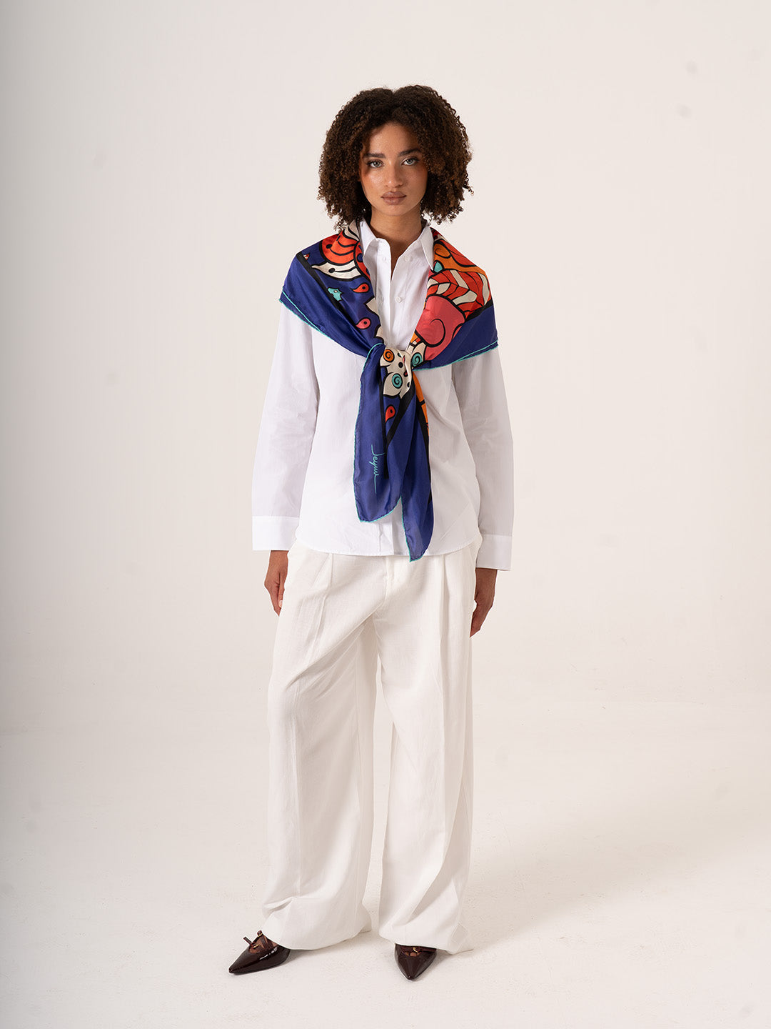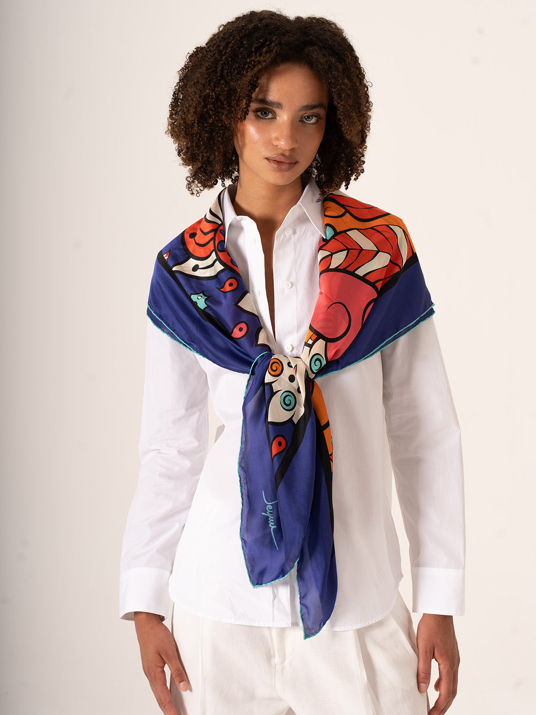 Fırça darbeleriyle serbest bırakılmış renkler, soyut desenlerle harmanlanmış figürler ve yaratıcılığın özgürce aktığı bir kompozisyon… El çizimi tasarımıyla bu özel fular, hayatı bir tuval gibi gören kadınlar için yaratıldı.