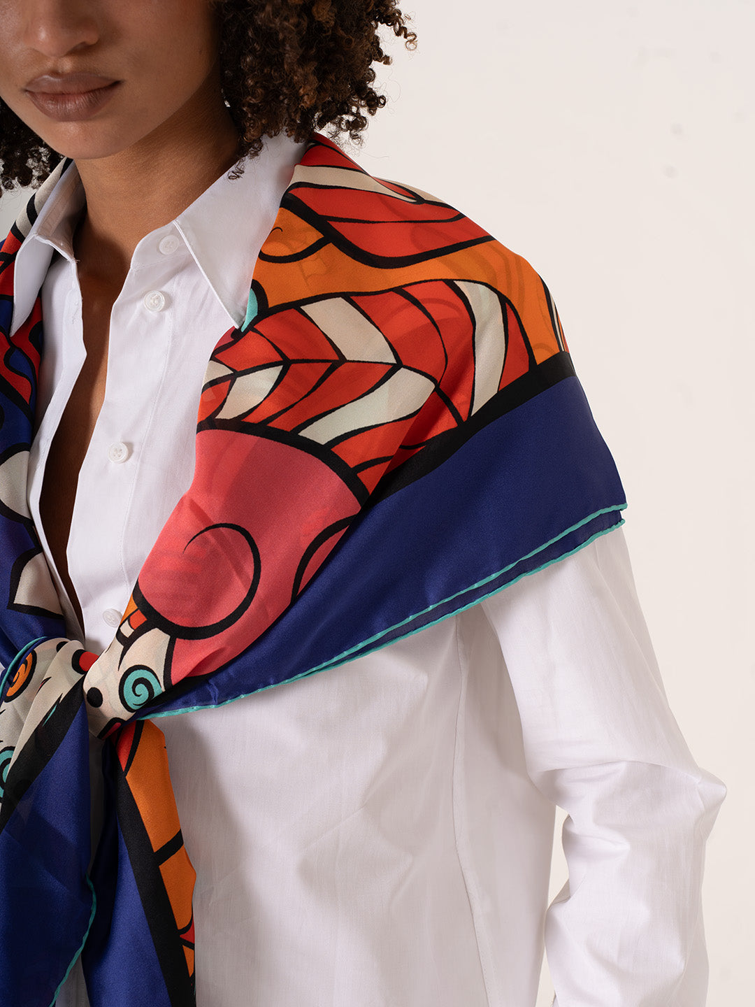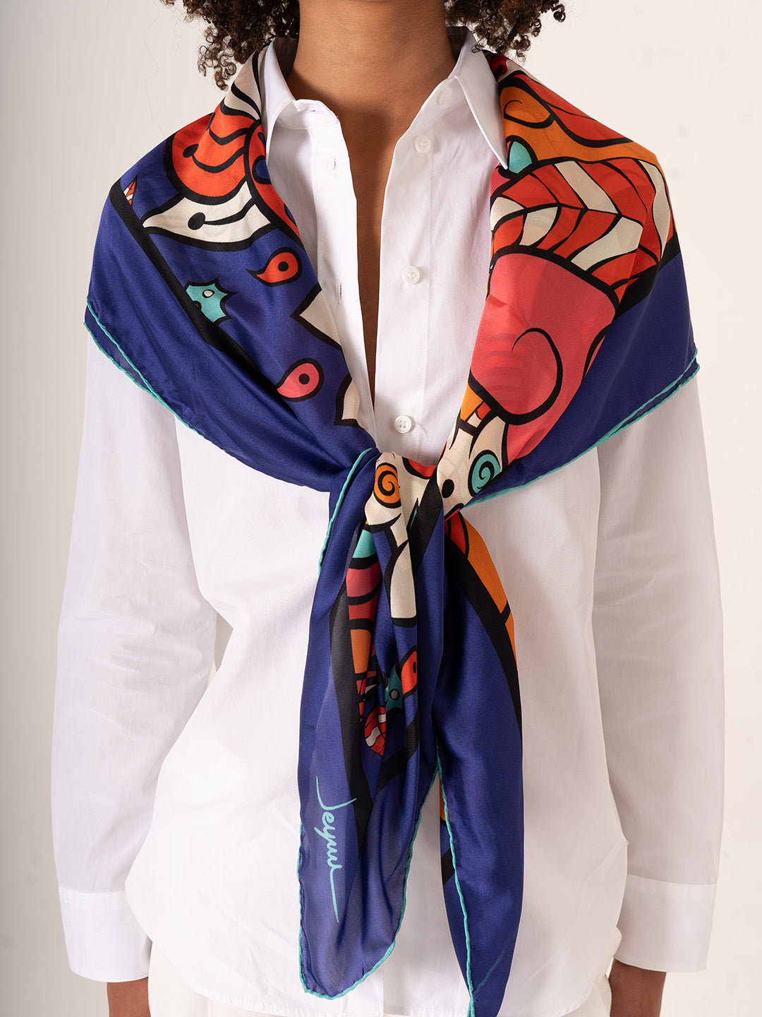 123x123 cm ölçüsüyle hem klasik hem yaratıcı kullanıma uygundur: boynunuzda zarif bir ifade, saçınızda özgün bir dokunuş, omzunuzda sanatsal bir tamamlayıcı ya da yazın pareo olarak… Hafif ve dökümlü alfa silk kumaşı, gün boyu zarif bir konfor sunar.