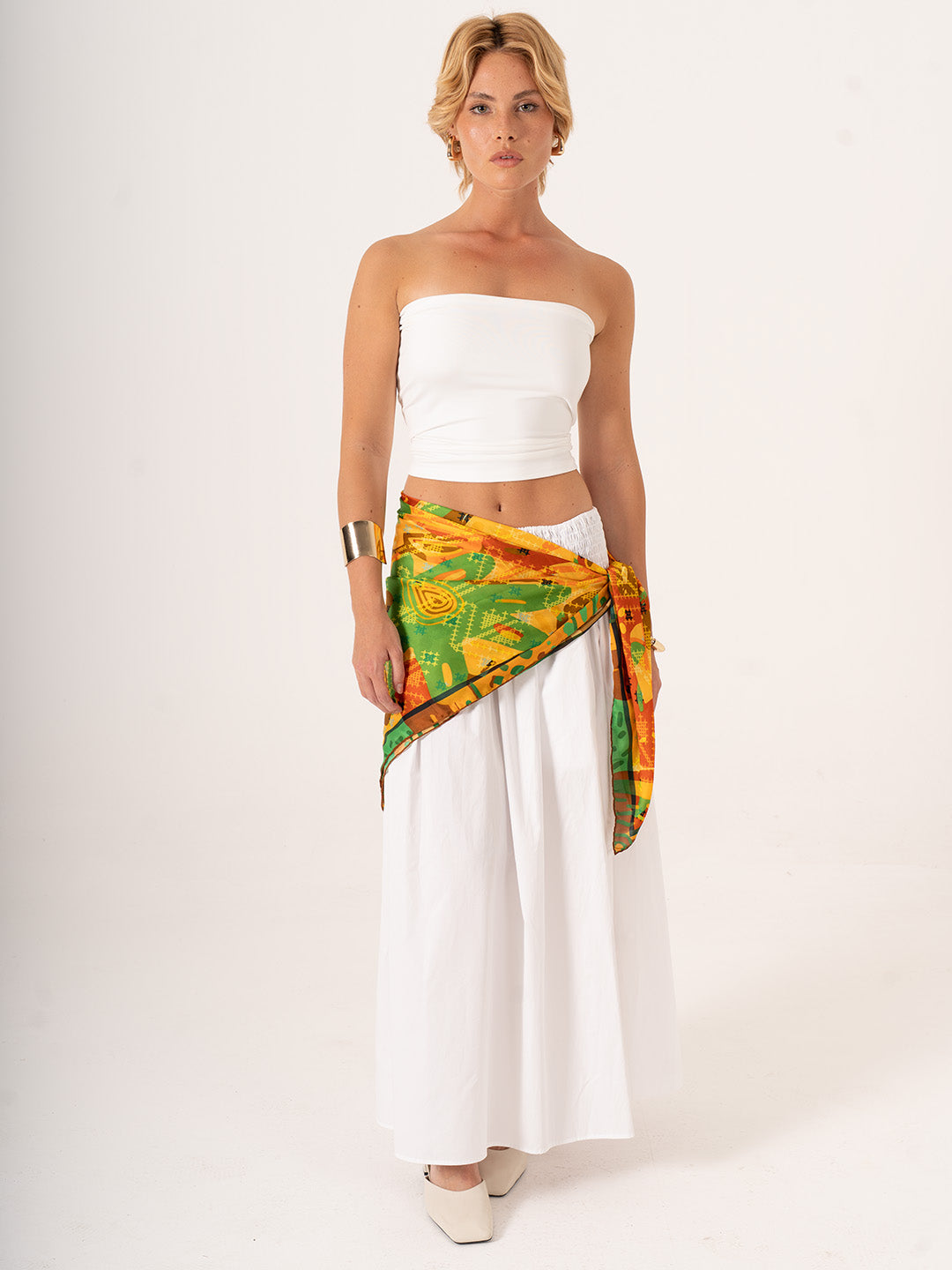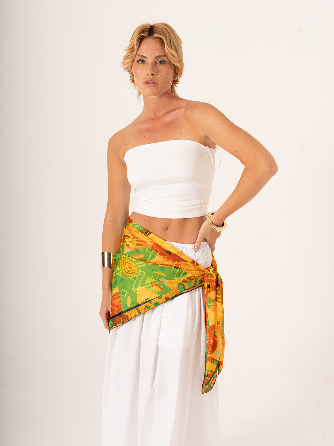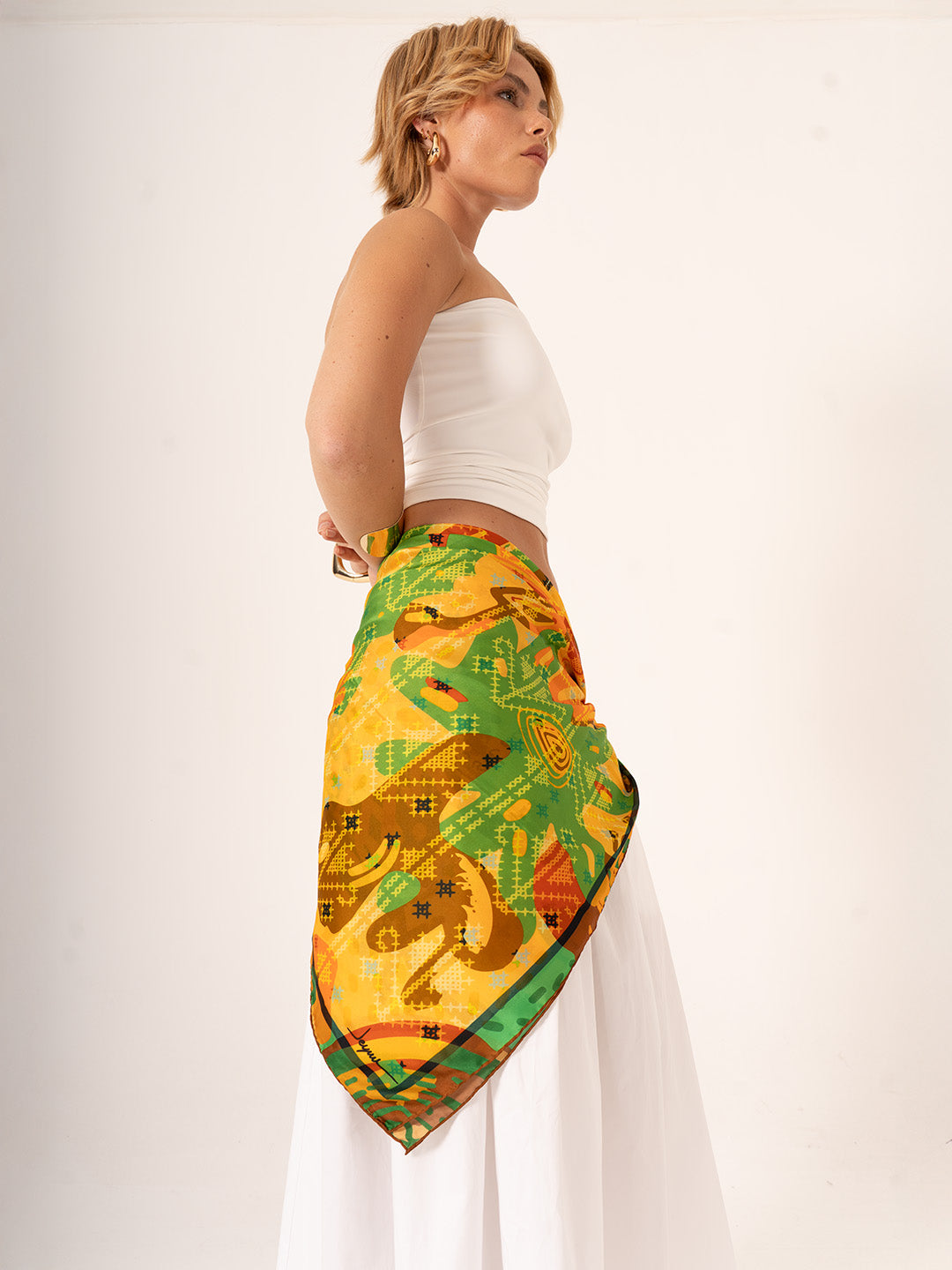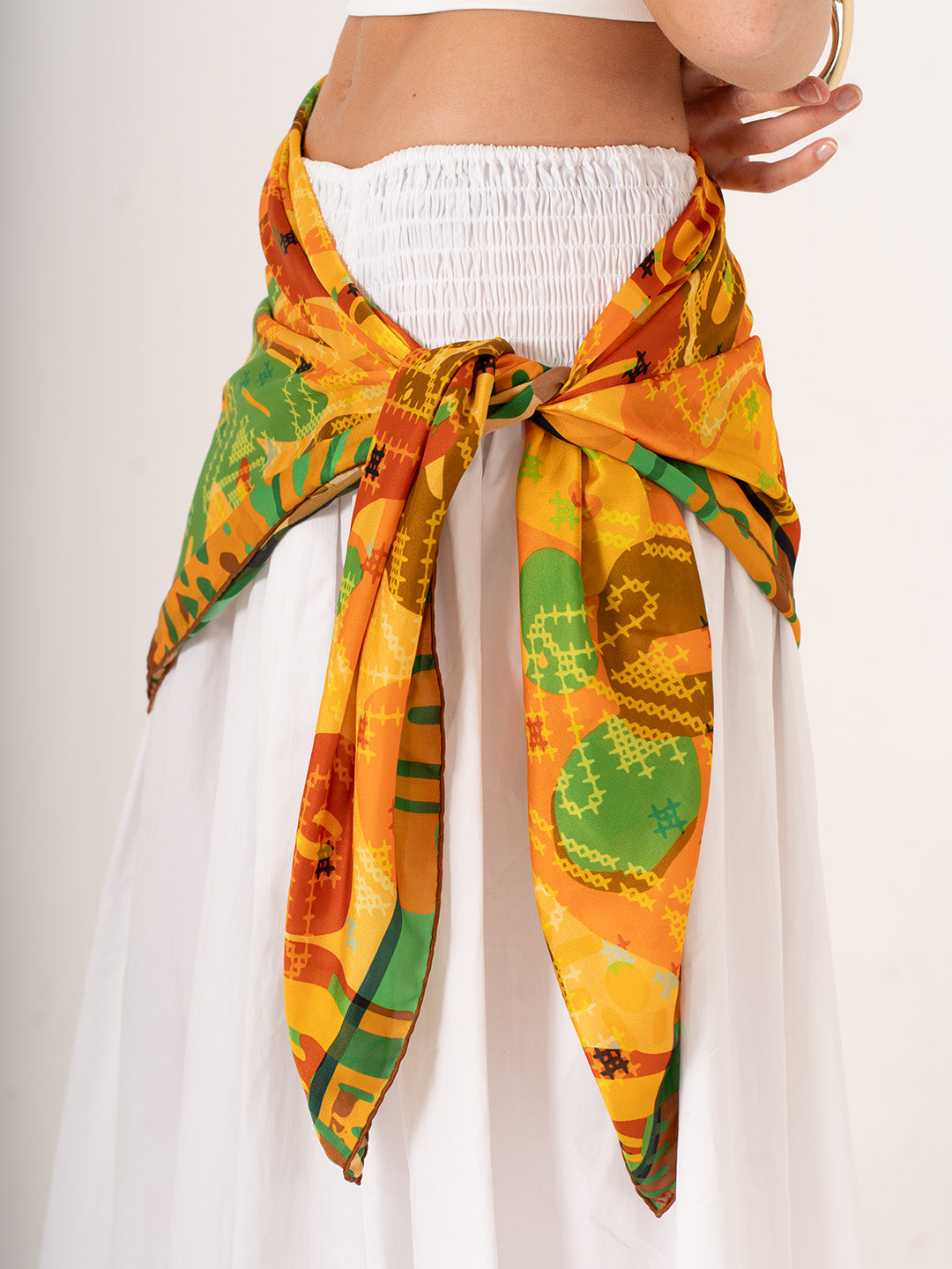 123x123 cm ölçüsü, bu özel parçayı çok yönlü ve dikkat çekici bir aksesuar hâline getirir: boynunuzda derinlikli bir ifade, saçınızda romantik bir dokunuş, omzunuzda şiirsel bir tamamlayıcı ya da yaz akşamlarında pareo olarak kullanılabilir. Hafif ve dökümlü Alfa silk kumaşı, hem görsel hem de fiziksel olarak yumuşaklık sunar.