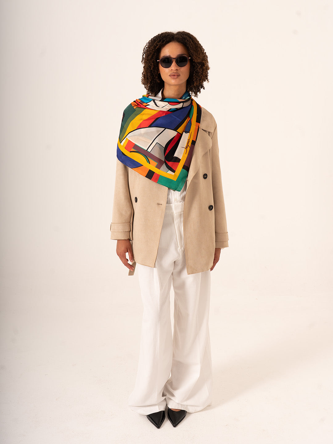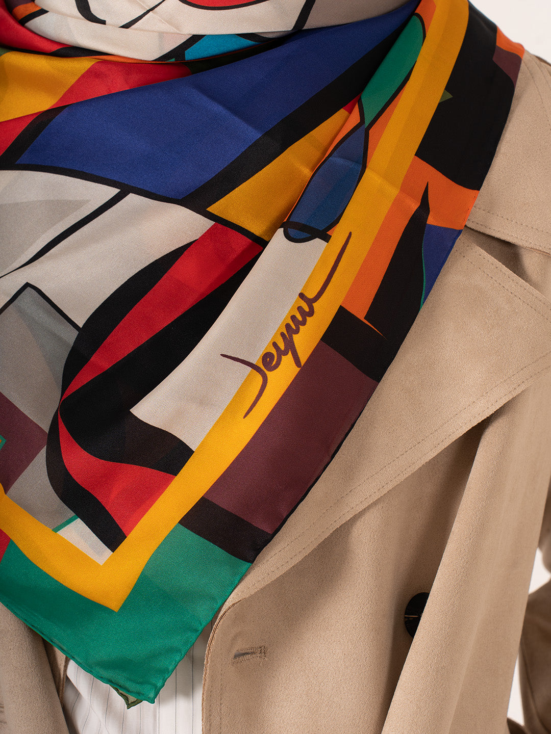 El çizimi göz figürleri, yüz hatları ve soyut kadın siluetleriyle bezenmiş bu özel fular; sezgi, duygu ve zarafeti bir araya getirir. Renkler sade ama güçlü; desenler ise anlam yüklü… Her kıvrımı bir duygunun izini taşır.