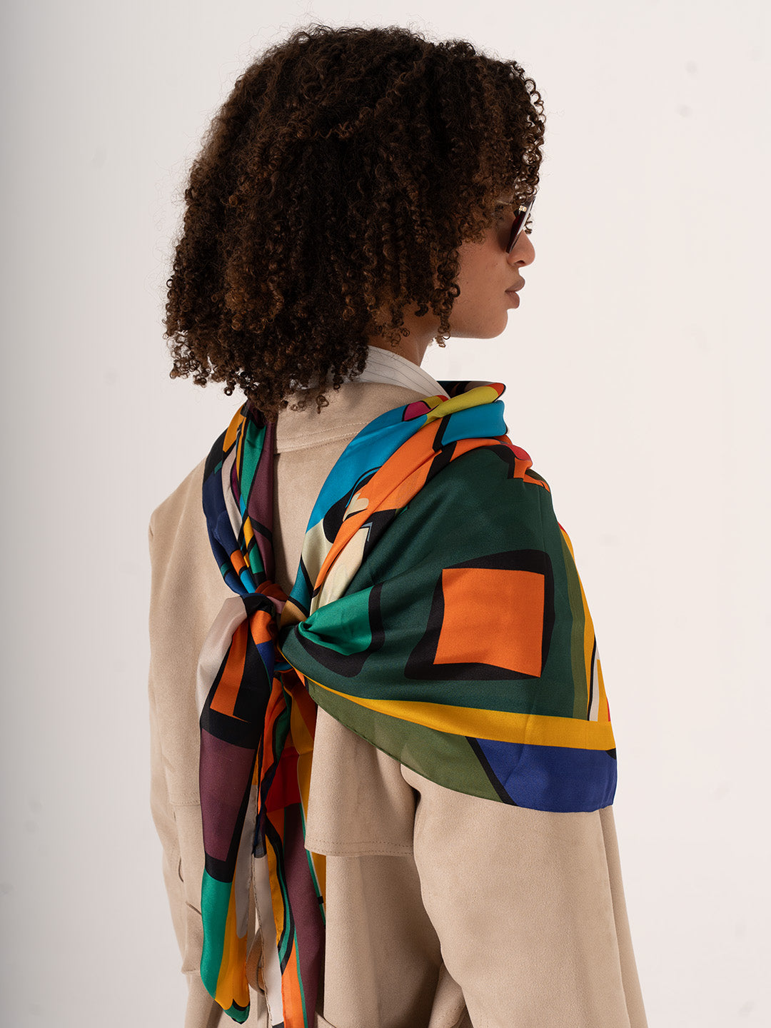 123x123 cm genişliği sayesinde boyun fuları, pareo, saç aksesuarı, omuz örtüsü ya da üst giyim tamamlayıcısı olarak farklı şekillerde kullanılabilir. Hafif ve dökümlü Alfa silk kumaşı, zarafetle konforu birleştirir.