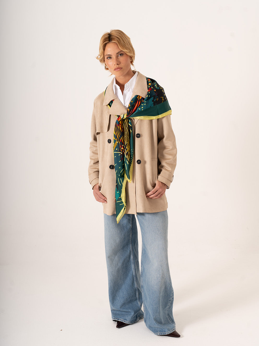123x123 cm ölçüsü sayesinde boyun fuları, pareo, saç aksesuarı, omuz örtüsü ya da üst giyim tamamlayıcısı olarak birçok şekilde kullanılabilir. Hafif Alfa Silk kumaşı ise yumuşak, dökümlü ve akışkandır; sizinle birlikte hareket eder.
