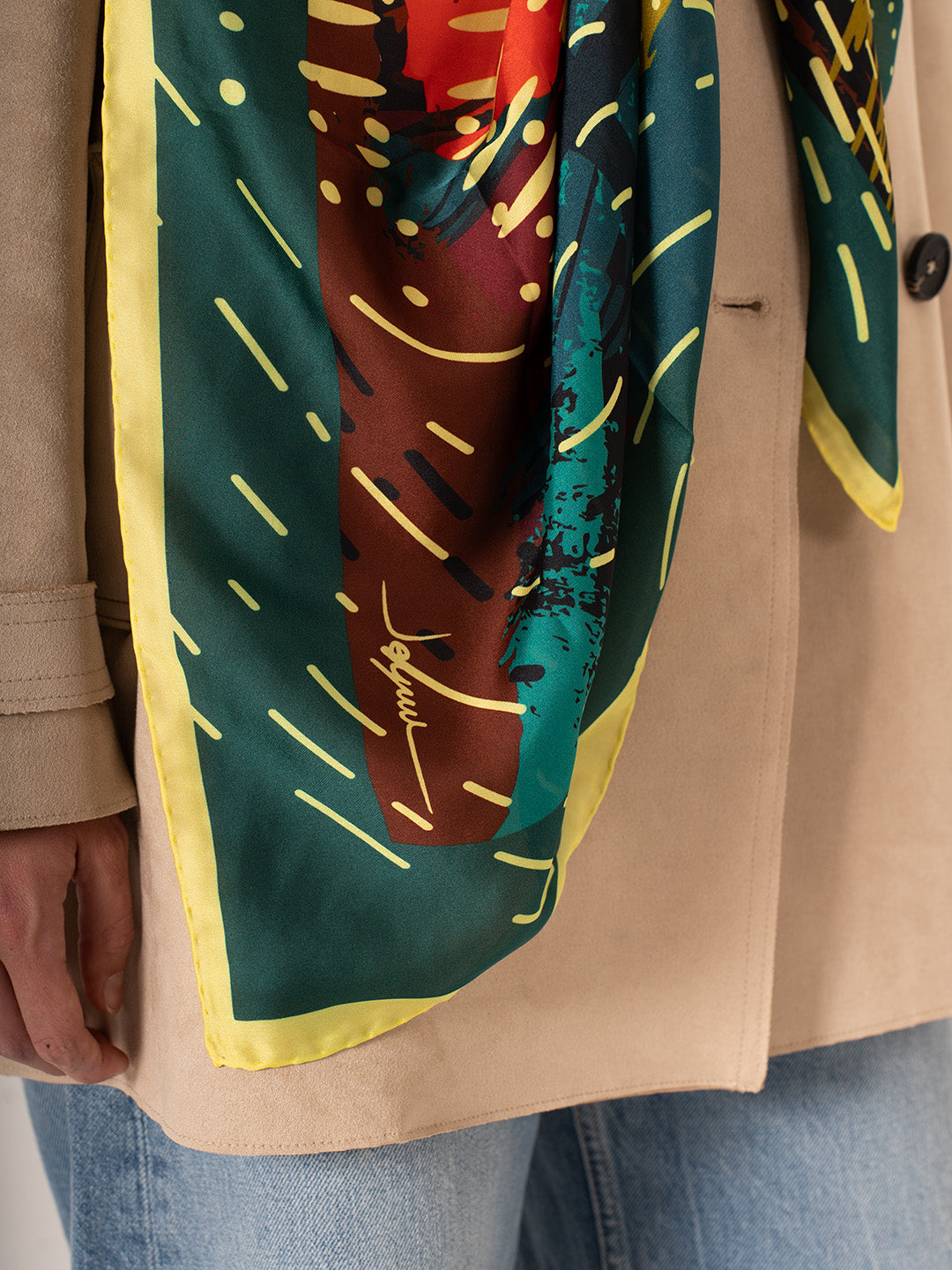 Bir adım atmakla atmamak arasında sıkışan zaman, yönsüz çizgiler, iç içe geçmiş renk lekeleri ve tamamlanmamış formlarla anlatılır. Bu fular, kararsızlığın sadece zayıflık değil; aynı zamanda bir durup hissetme hâli olduğunu zarifçe hatırlatır.