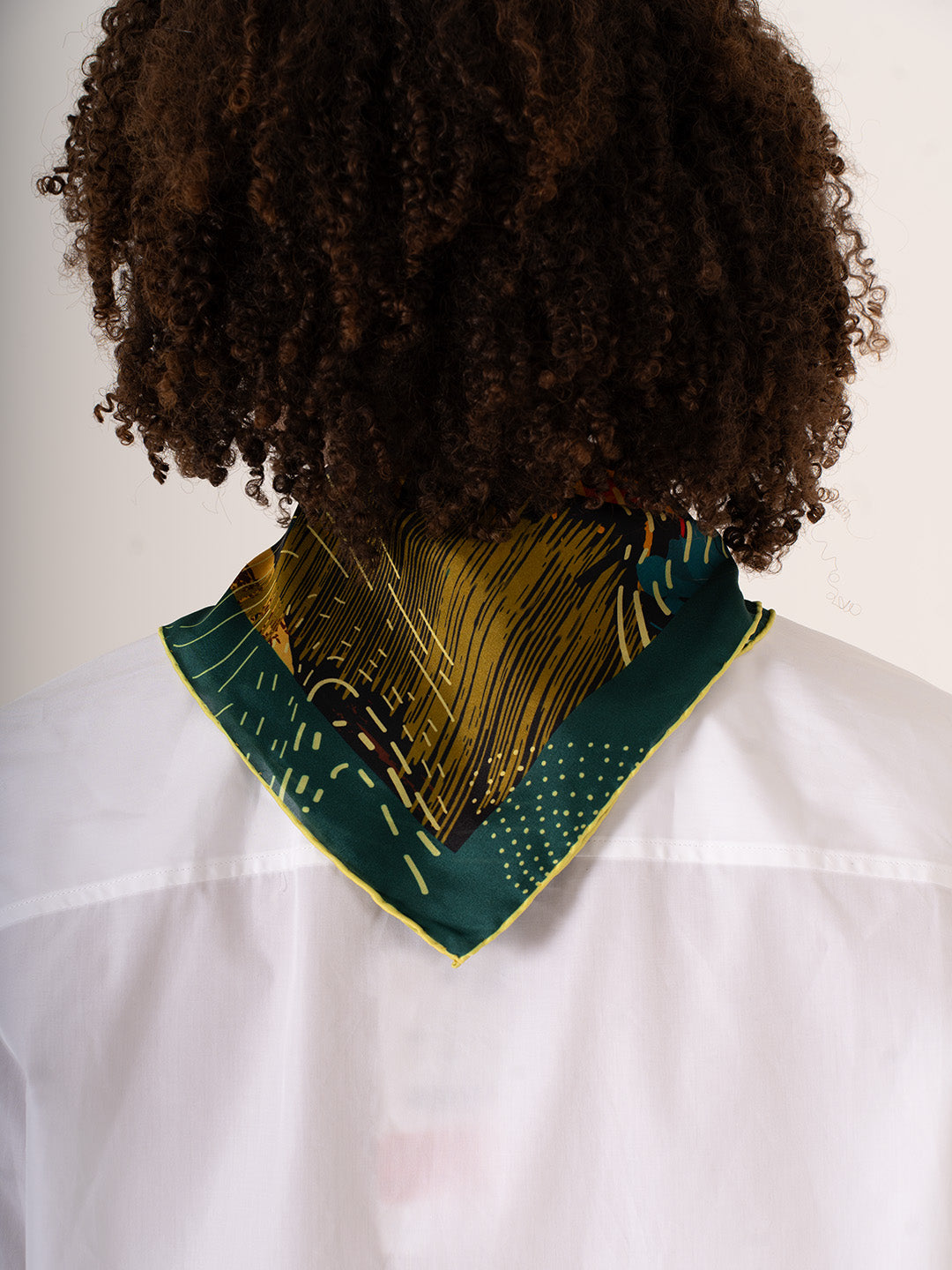 El çizimiyle şekillenen soyut figürler, yönsüz çizgiler ve birbirine karışan renk blokları; kararsızlığın karmaşasını ve zarafetini bir araya getiriyor. Bu fular, net olmayan duyguların ve “belki”lerin zarif bir sembolü.