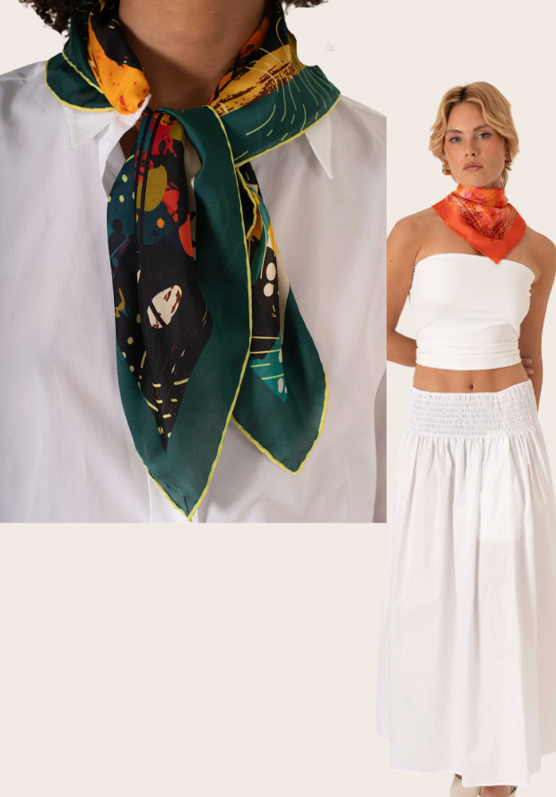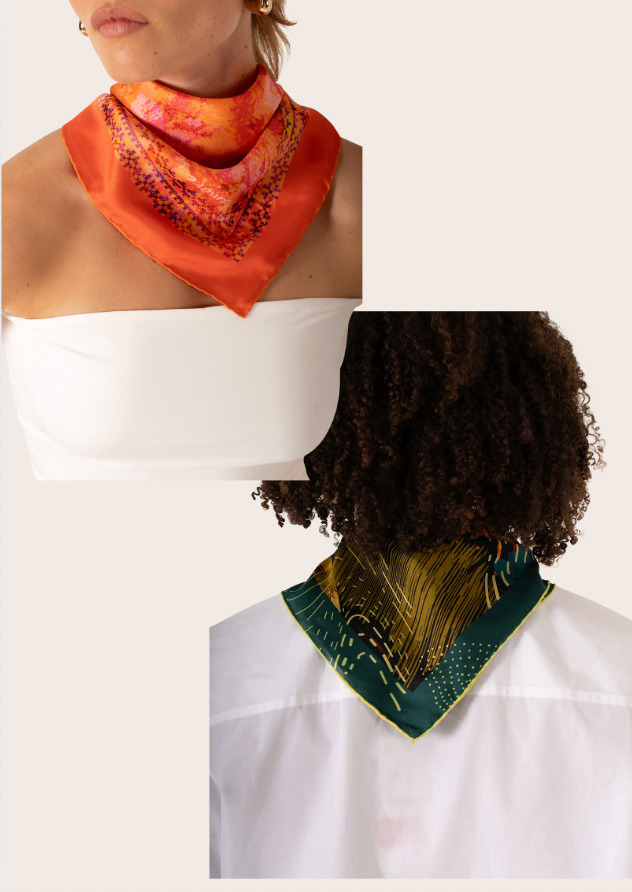 Her iki tasarım da 68x68 cm ölçüsüyle boyun fuları, saç bandı ya da çanta aksesuarı olarak çok yönlü kullanım sunar. Şifon satenin hafifliği ve Alfa Silk’in ipeksi dokusu, gün boyu konforlu bir akış sağlar.