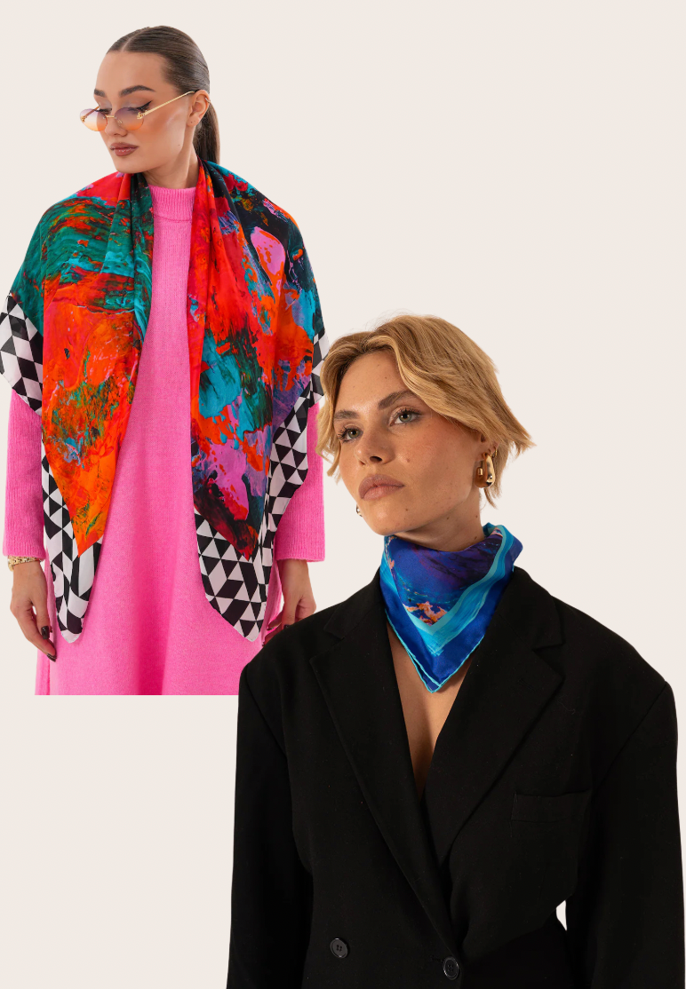 La Costa Blu ve Sangue e Antidoto… Biri yaz akşamının hafifliğini taşıyan sahil ruhu, diğeri modern sanatın güçlü kontrastlarını yansıtan cesur bir ifade. Bu özel paket, iki farklı dünyanın enerjisini tek bir seçkide birleştiriyor. La Costa Blu’nun el çizimi sahil detayları, tuzlu rüzgârı ve güneş yansımalarını hatırlatan desenleri 68x68 cm kompakt boyutuyla boyun, saç veya çantada hafif bir yaz dokunuşu sunarken; 123x123 cm geniş ölçüdeki Sangue e Antidoto %100 Alfa Silk kumaşı, sanatsal renk geçişleri ve dinamik motifleriyle hem şal hem pareo hem de omuz aksesuarı olarak güçlü bir stil alanı yaratıyor. Hafiflik ve özgürlükle başlayan hikâye, sanat ve kontrastla tamamlanıyor—iki farklı ruh, tek bir paket içinde.