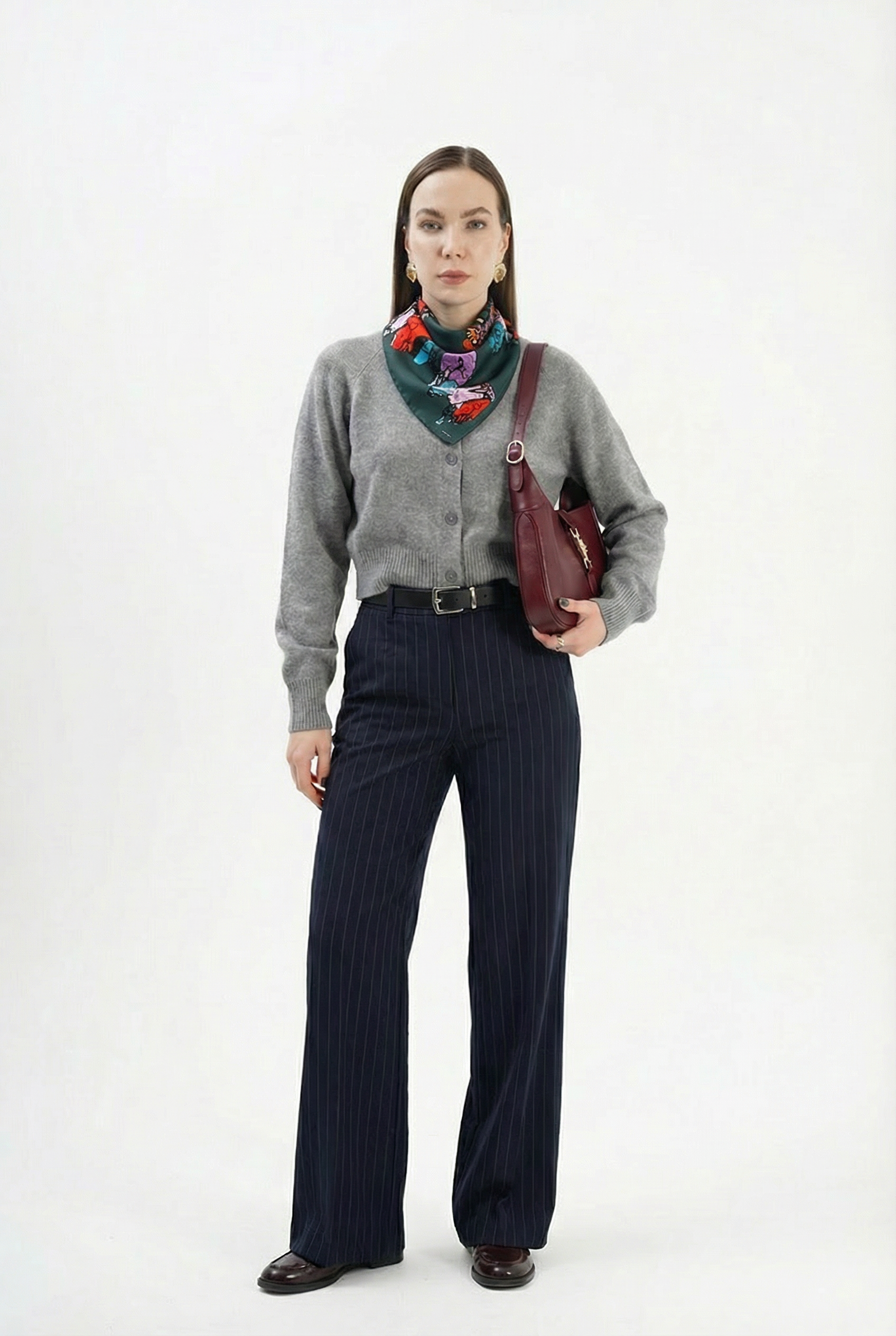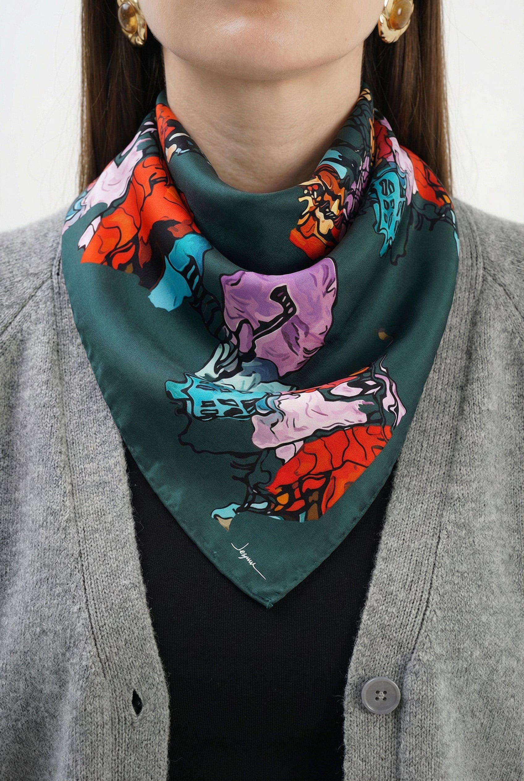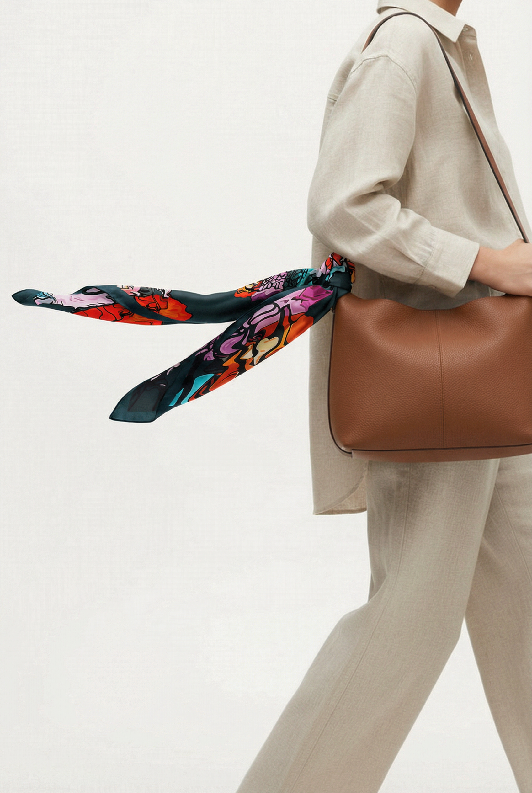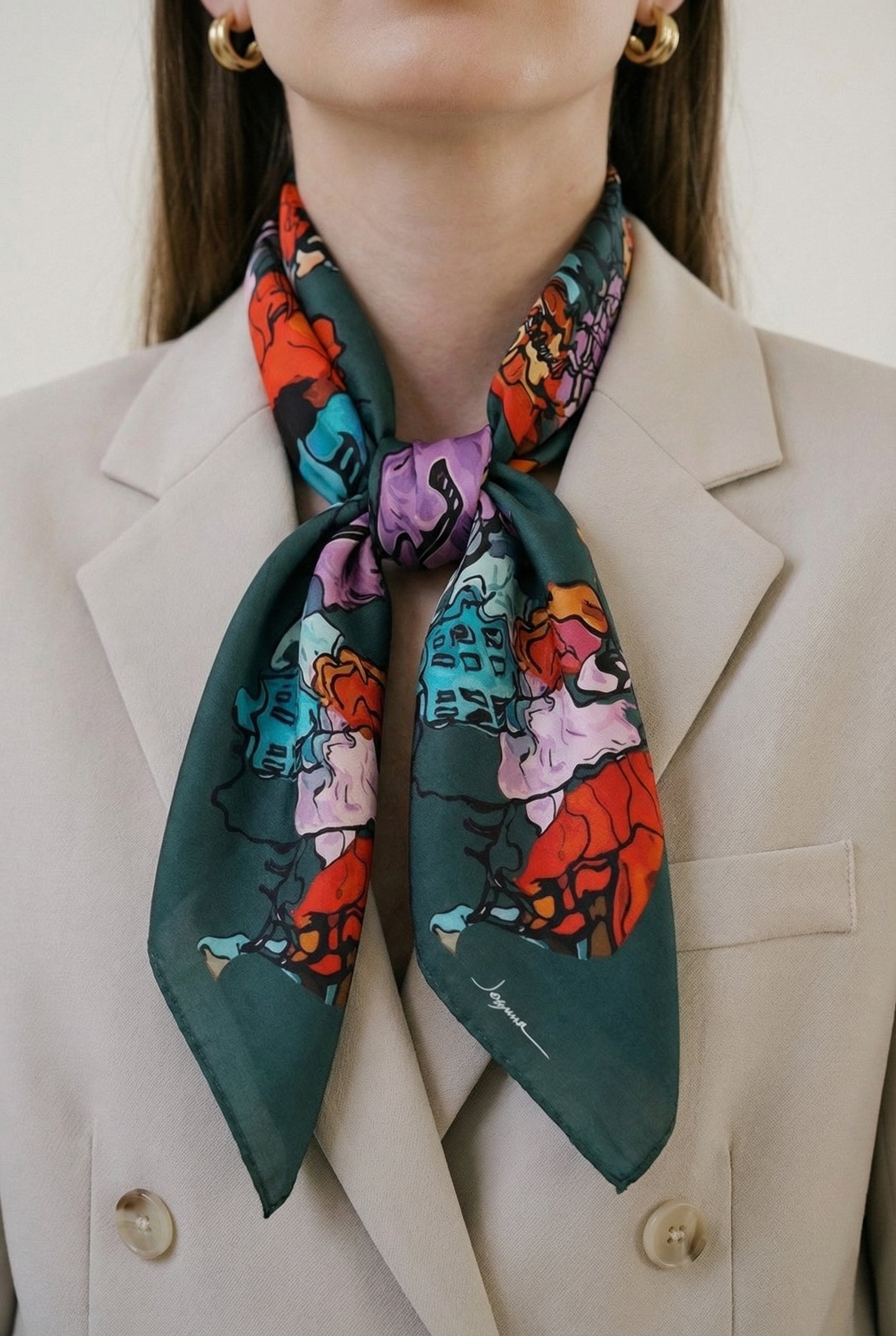 68x68 cm ölçüsüyle çok yönlü bir stil parçasıdır. Boyunda modern bir vurgu oluşturur, saçta dinamik bir aksesuar olarak kullanılabilir ya da çantaya bağlandığında kombine sanatsal bir detay ekler.